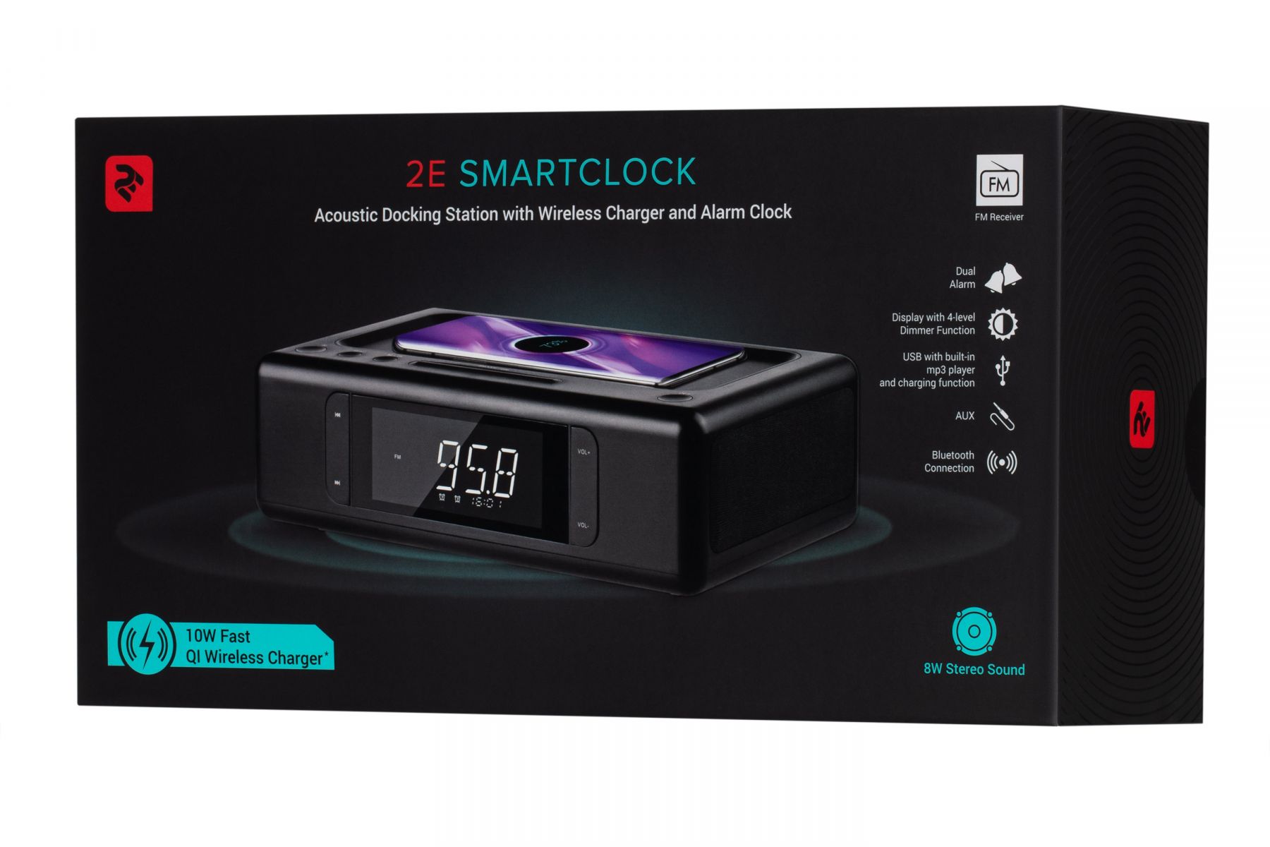 2E SmartClock – це годинник, будильник, FM-радіо, акустична система та бездротова зарядка. Відтворення контенту відбувається через Bluetooth, AUX 3,5 мм, FM-радіомовлення (можливість запам’ятовування 20 станцій) або через під’єднаний USB-накопичувач для програвання аудіотеки власника. Пристрій має два незалежні один від одного будильники, що можна програмувати. Сигнал будильника можна змінювати. Димірування яскравості екрана. Потужність динаміків 2 × 4 Вт. Діапазон частот 20-20000 Гц.