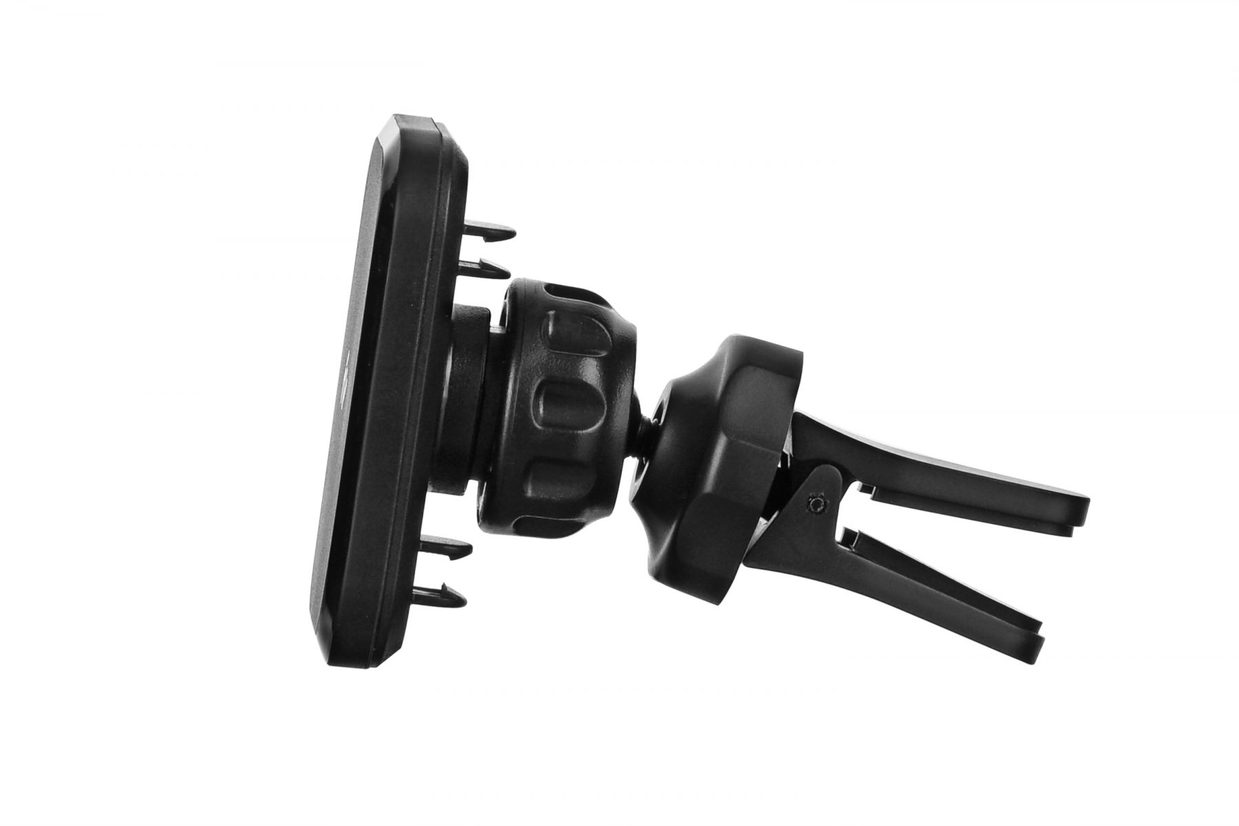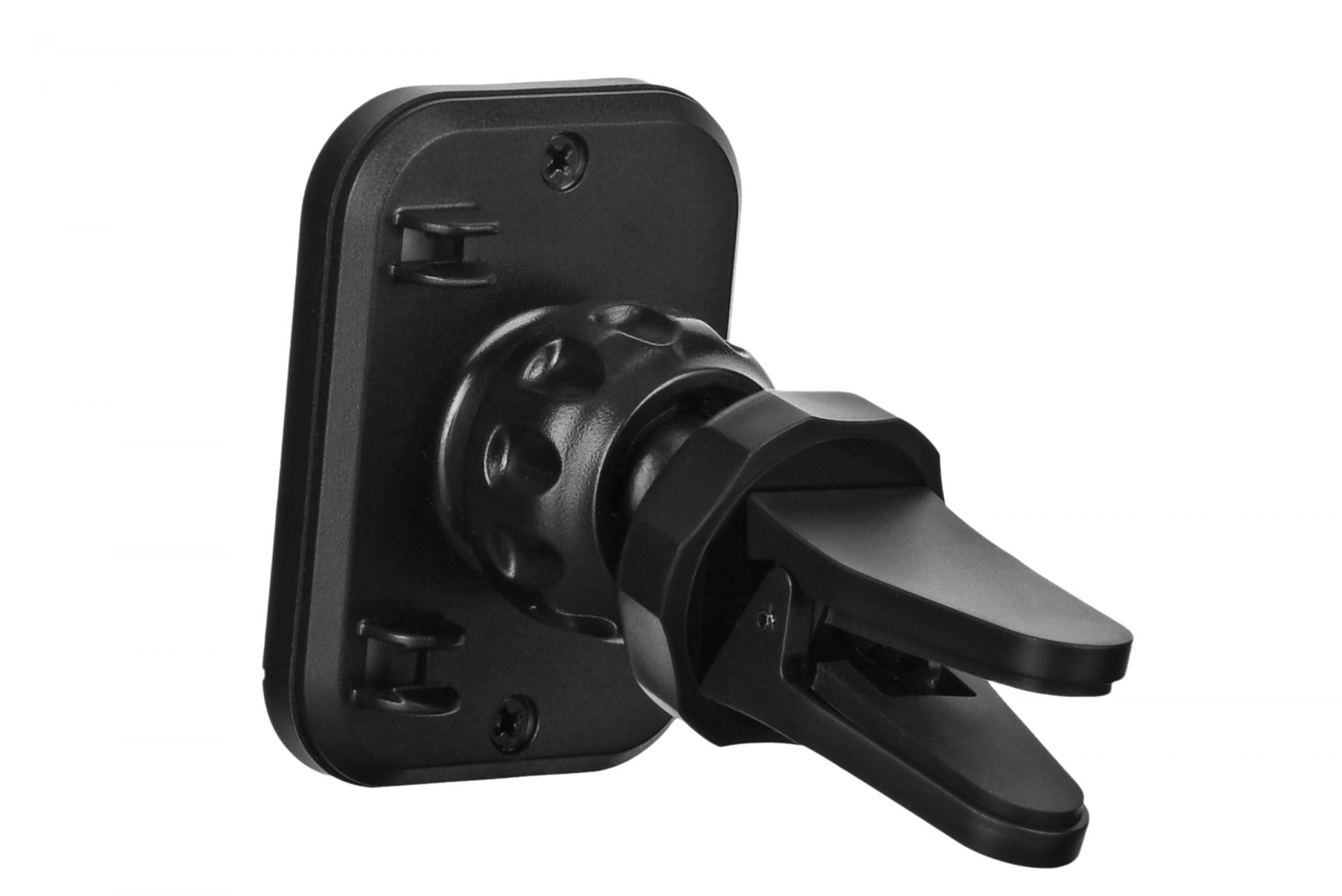 Компактний автомобільний тримач з магнітним вкладишем. Для фіксації в авто використовується затискач, а для фіксації мобільного пристрою передбачено магнітний вкладиш зі стрічкою 3М.