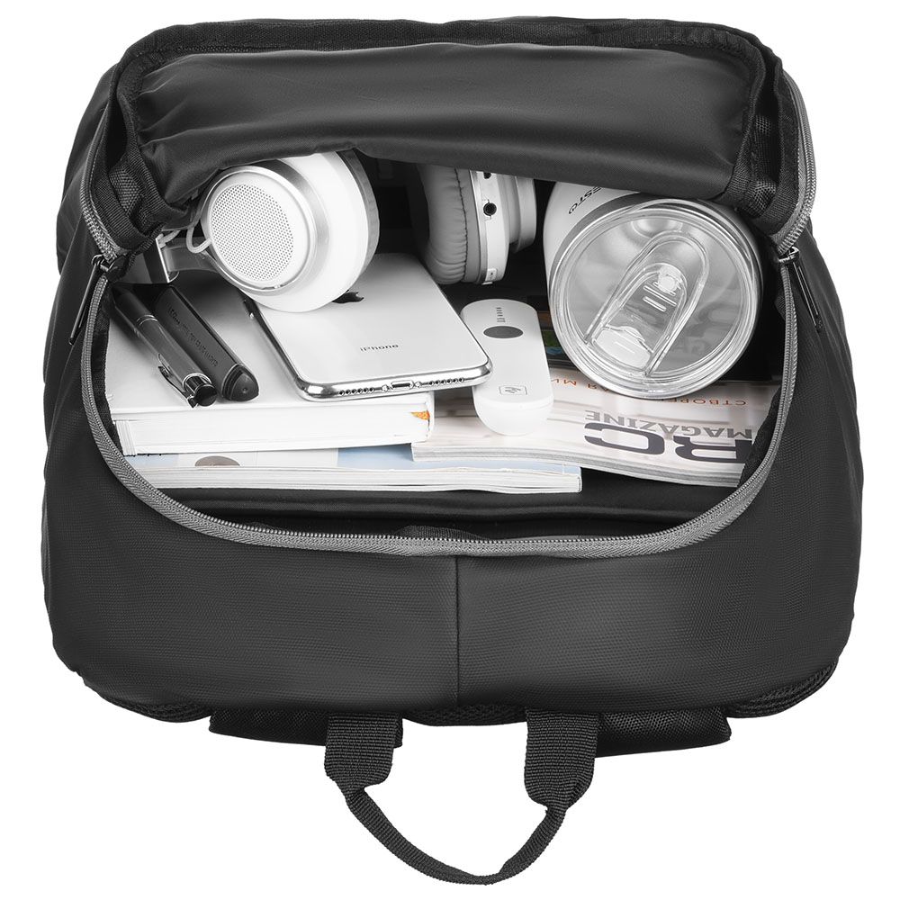 Рюкзак чорного кольору з сірими вставками для повсякденного використання та подорожей. Зовнішня частина виконана з водовідштовхуючого матеріалу, а внутрішня амортизує поштовхи та удари.