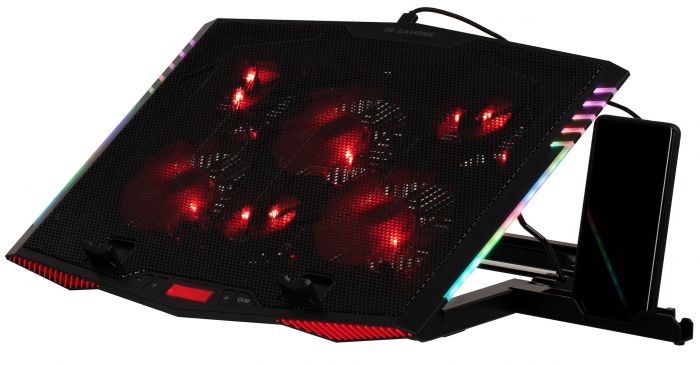 Додатково:прогумовані ніжки, 6 вентиляторов, прогумовані холдери для фіксації ноутбука, LCD-дисплей, 7 рівнів регулювання RGB-підсвічування, тримач для смартфона