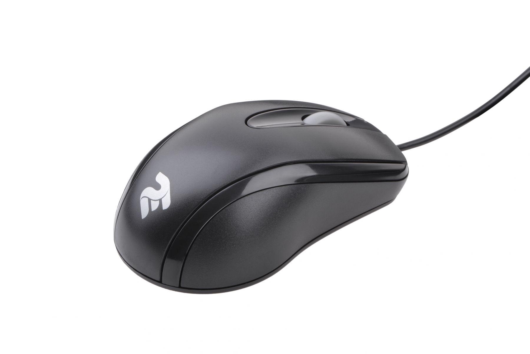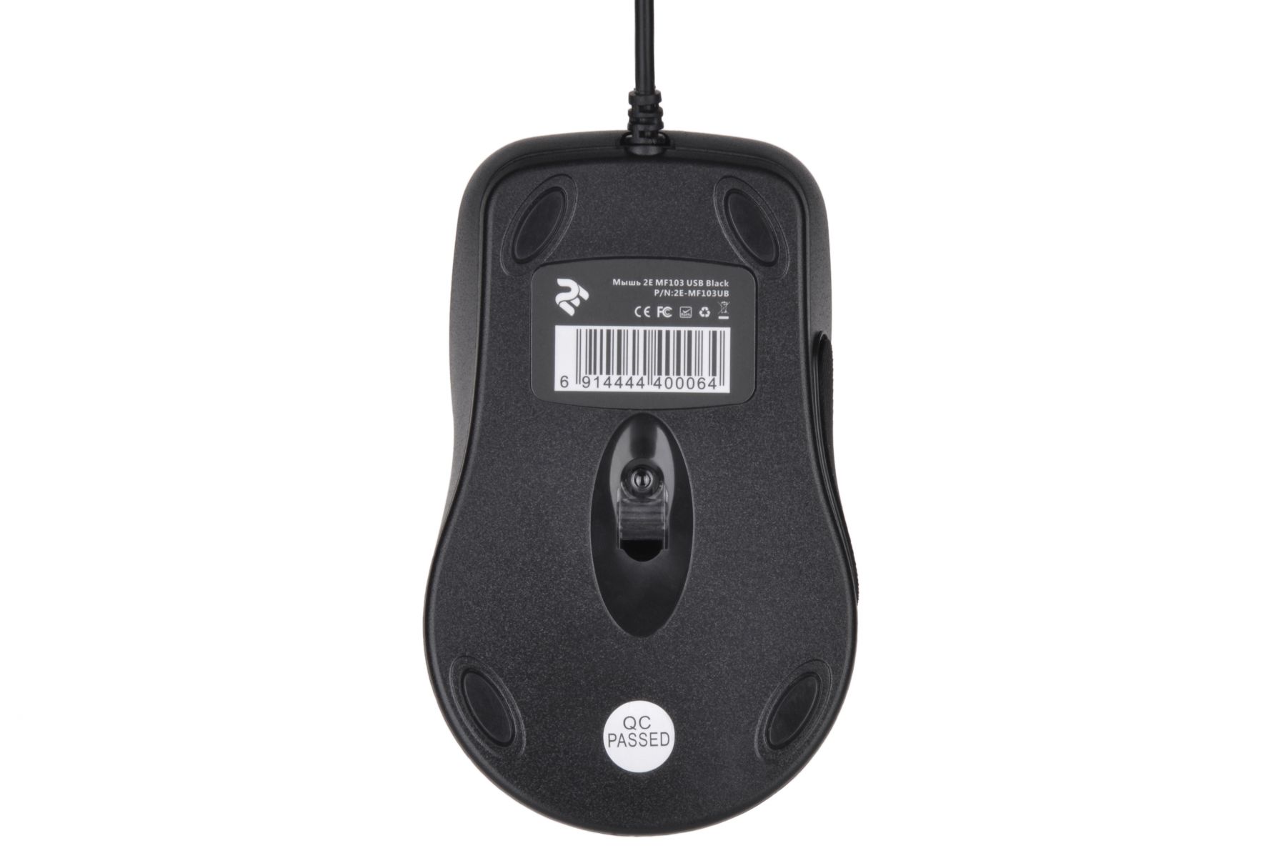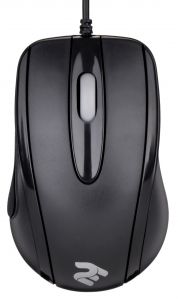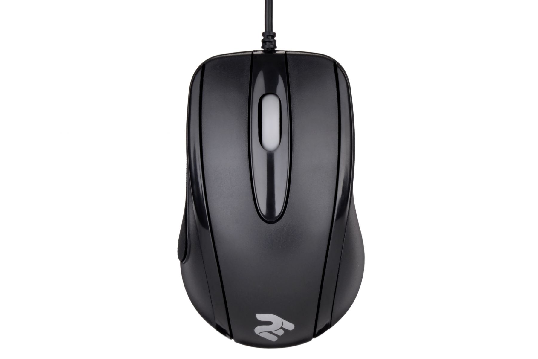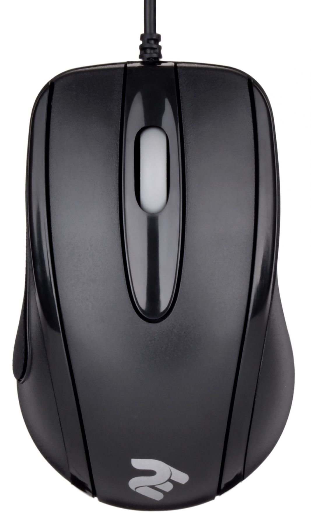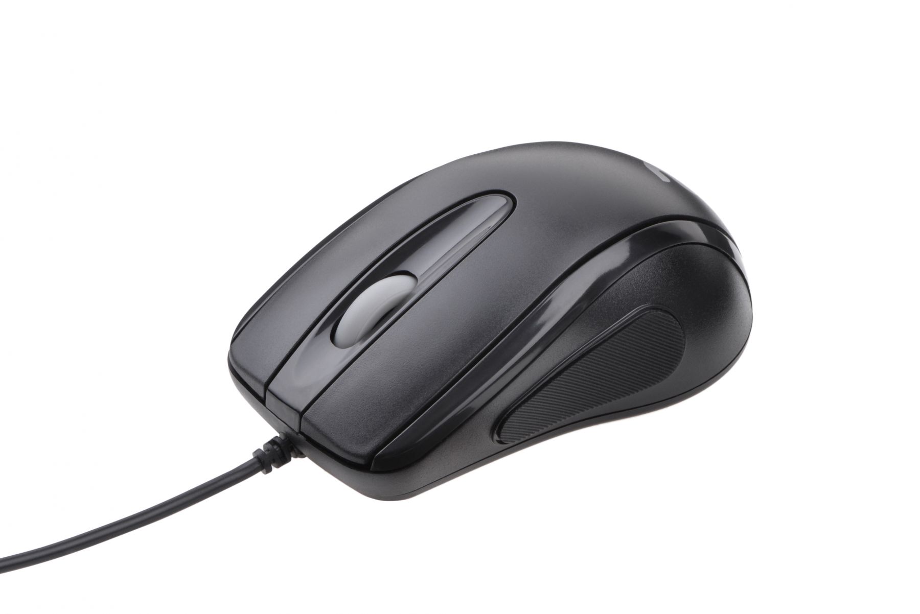 Компактна дротова миша з матовою поверхнею, прогумованою вставкою та симетричною формою корпусу.