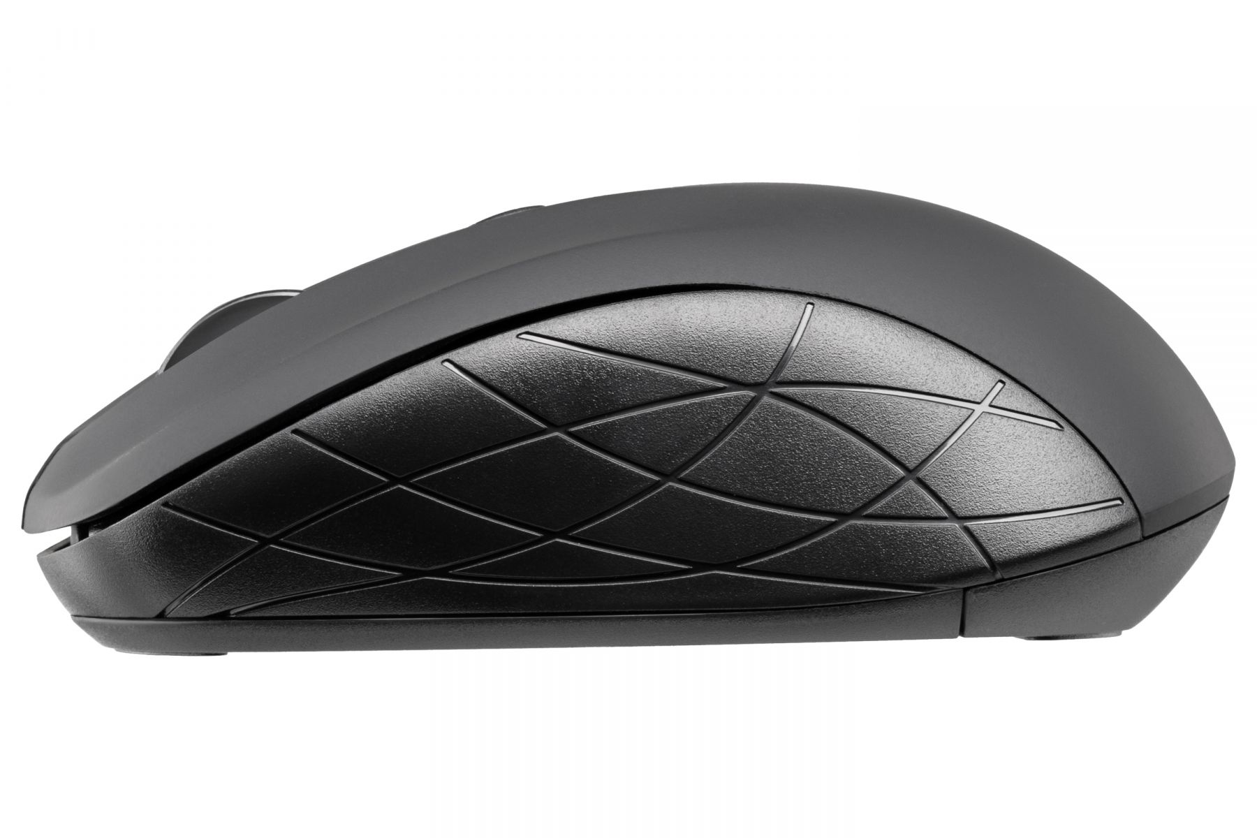 Бездротова ергономічна миша з матового пластика забезпечить комфортну роботу протягом тривалого часу. Виконана в класичному дизайні в чорному кольорі і з геометричними вставками на бічних сторонах миші. Швидкість курсора налаштовується під власні вимоги: 800, 1200 або 1600 DPI.