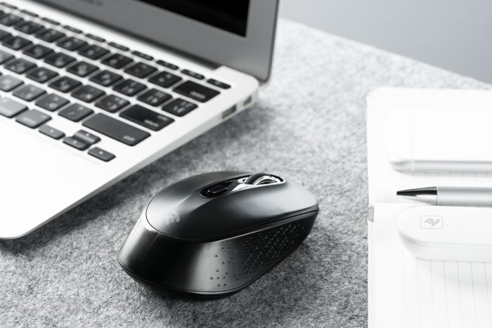 Бездротова миша виконана в зручній симетричній формі в чорному кольорі. З нею комфортно працювати тривалий час як правою, так і лівою рукою. Миша працює безшумно, тому її зручно використовувати будь-де та в будь-який період часу, нікому не заважаючи звуком кліку, а завдяки невеликій формі - зручно брати з собою.