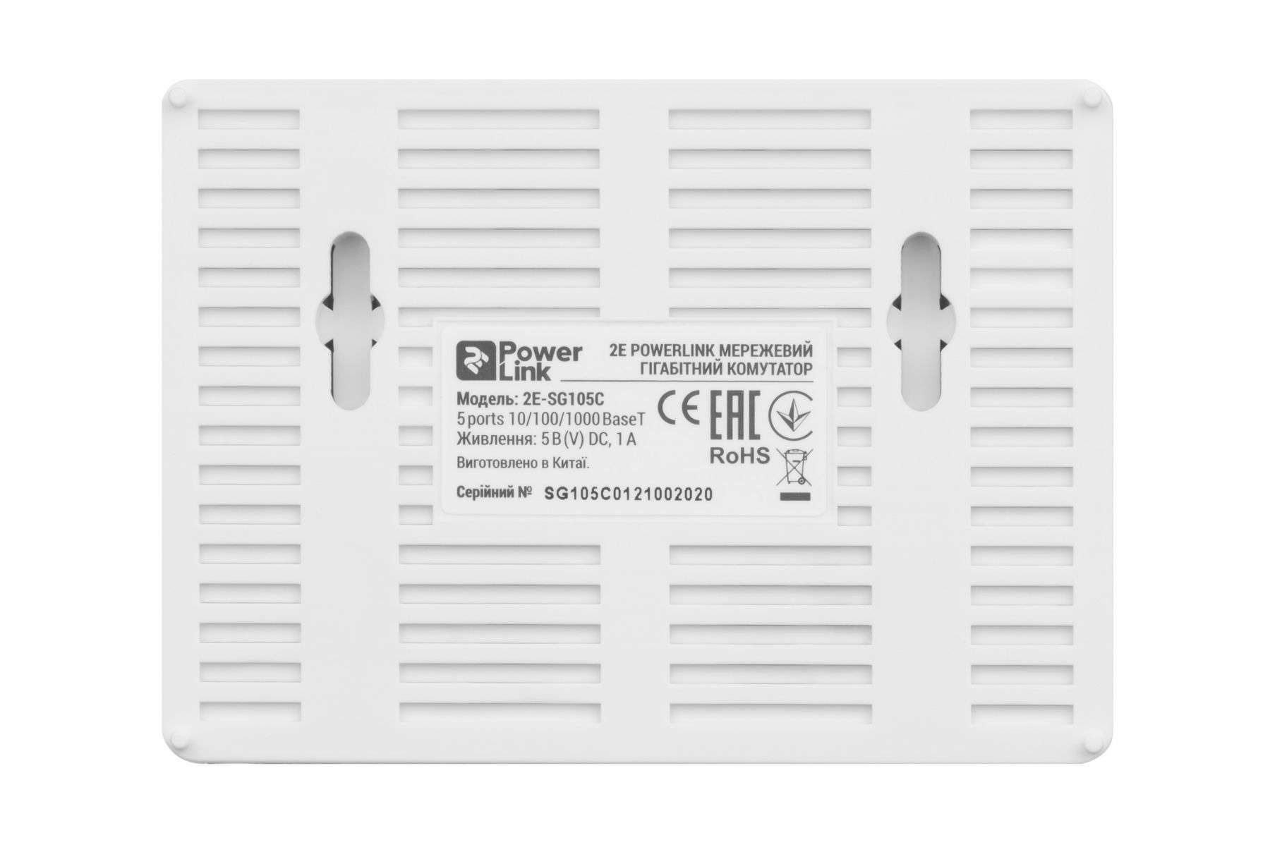 Для приєднання кількох пристроїв до локальної мережі призначений окремий вузол – комутатор 2E PowerLink SG105C 5 × GE. Пристрій є некерованим. Комутатор оснащено 8 портами – саме таку кількість пристроїв можна легко приєднати. Виробник подбав про захист, надавши комутатору надійний пластиковий корпус універсального білого кольору.