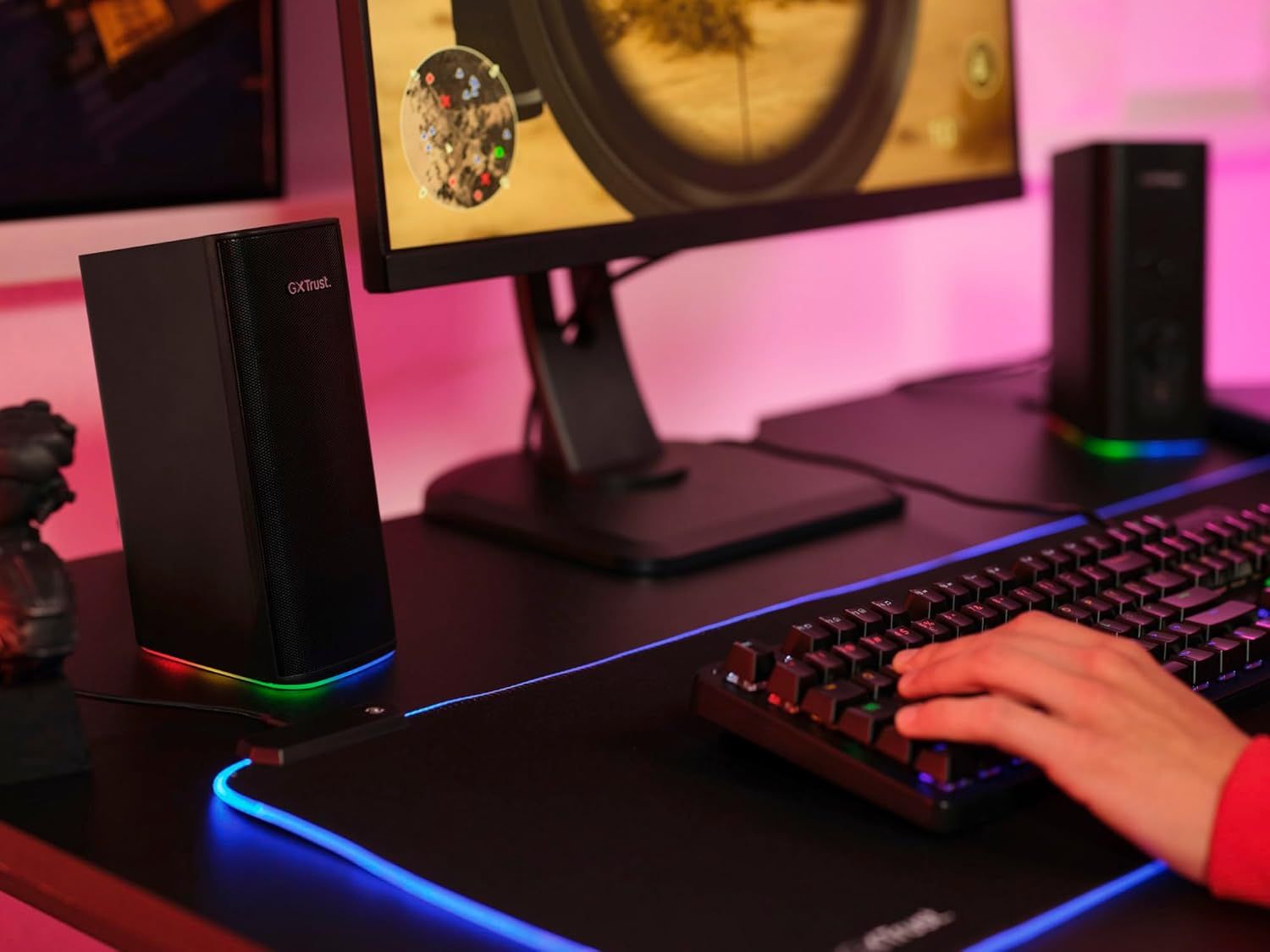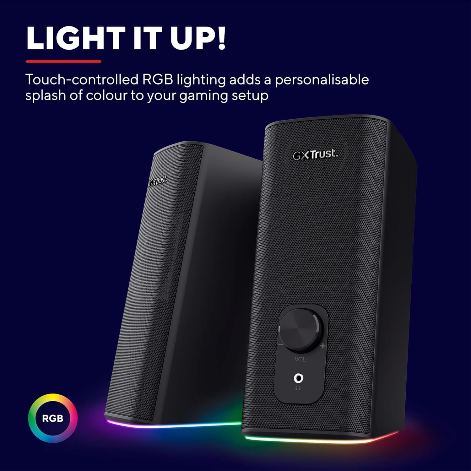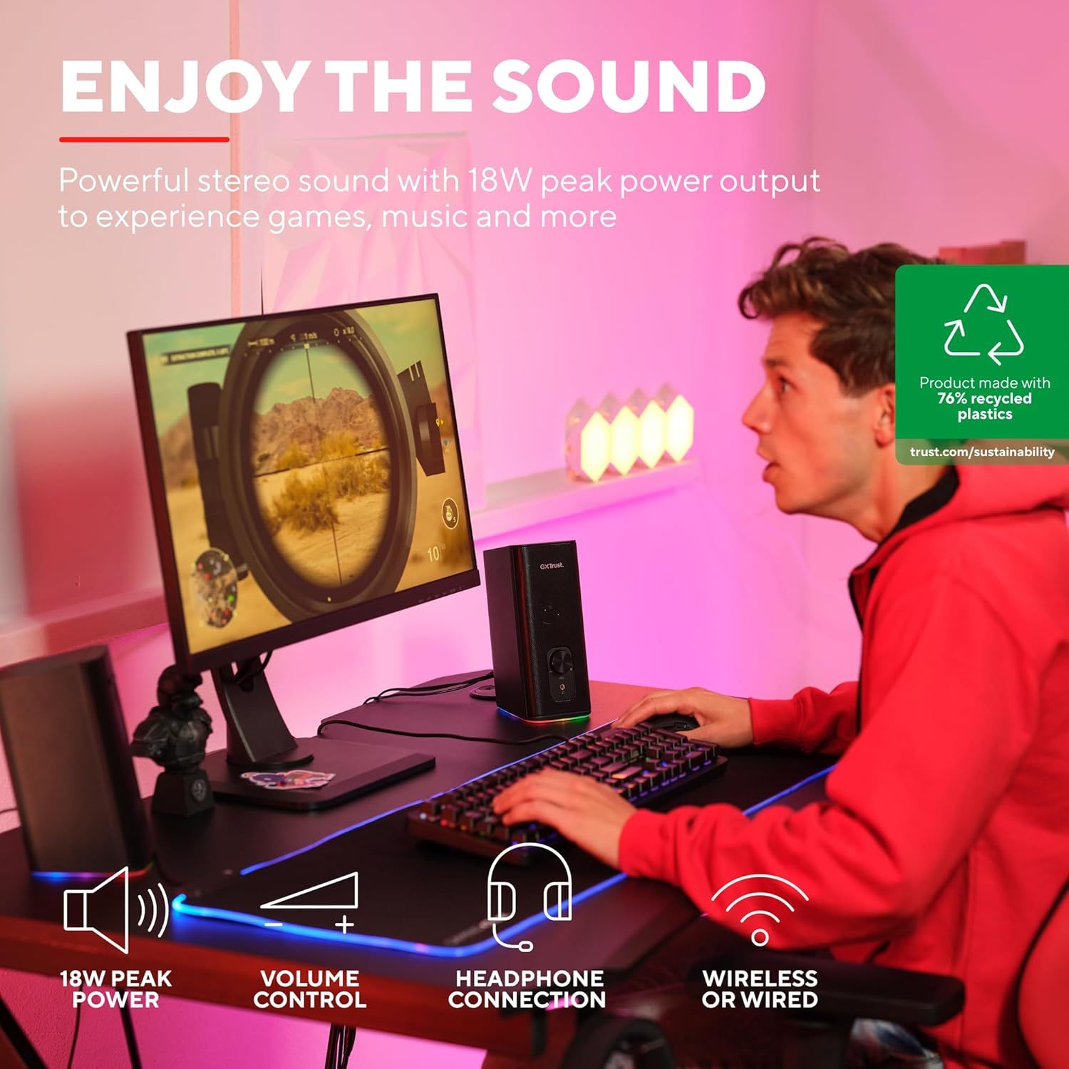 Trust GXT 612 Cetic — стильна 2.0 акустична система із Bluetooth, USB і AUX, виготовлена на 76 % із переробленого пластику. Забезпечує потужність до 18 Вт, має сенсорне RGB-підсвічування, USB-живлення — без розетки, прямо від ноутбука чи ПК. Зручна ручка регулювання гучності й роз'єм для навушників — стильне доповнення до ігор і фільмів