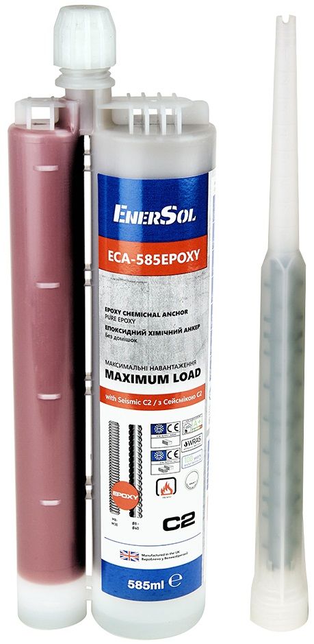 Анкер хімічний EnerSol ECA-585EPOXY об'ємом 585 мл на основі епоксидної смоли без розчинників забезпечує міцне кріплення в бетоні та природному камені. Склад затверджується в сухих, вологих і заповнених водою отворах, допускає монтаж над головою та різні глибини закладання. Сертифікація ETA Option 1, TR023, пожежостійкість F30–F120 та придатність для сейсмічних зон C1+C2 підтверджують надійність у критичних конструкціях.