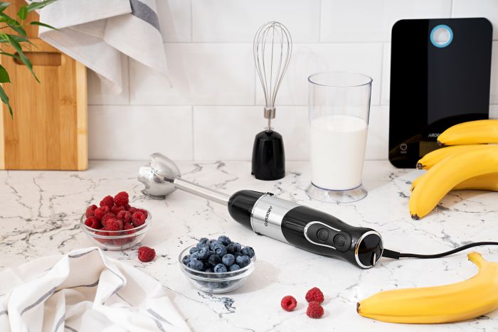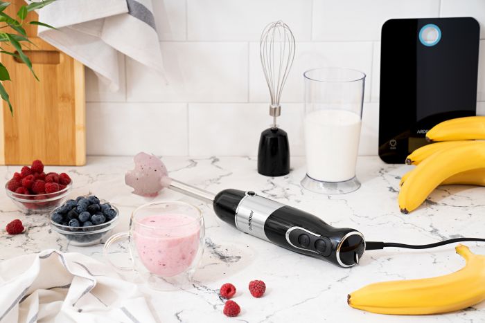 Ергономічний ручний блендер ARDESTO HBK-800BR занурювального типу потужністю 800 Вт стане у пригоді під час приготування соусів, супів, майонезу, дитячого харчування та молочних коктейлів. Комплектується мірним стаканом 600 мл та насадкою-віничком.