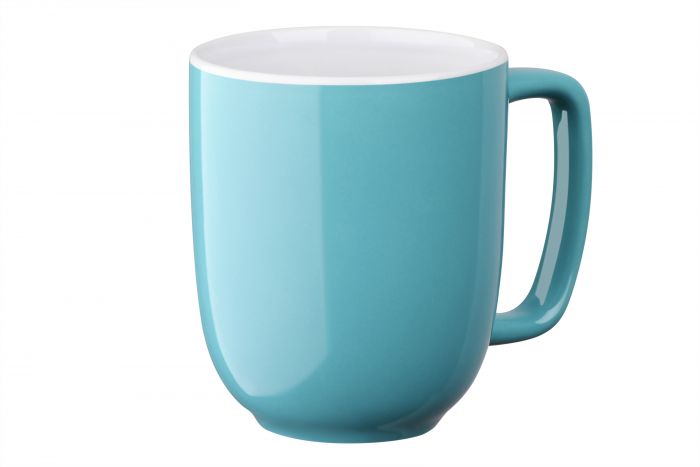 Керамічна чашка блакитного кольору заввишки 10 см і має об’єм 390 мл. Можна мити в посудомийній машині та використовувати в мікрохвильовій печі.