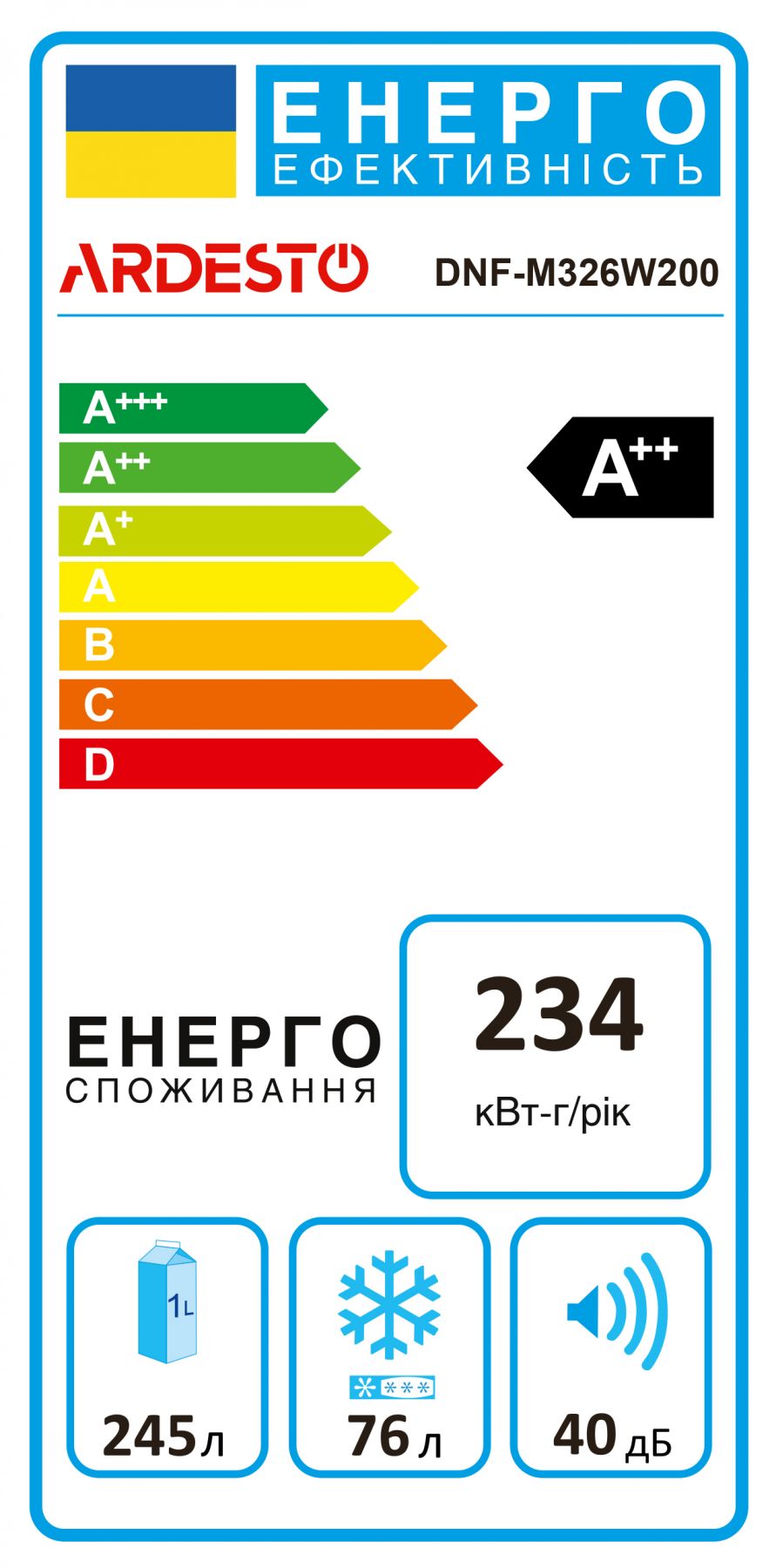 Холодильник з нижн. мороз. камерою ARDESTO DNF-M326W200, 200 см, 2 дв., Холод.відд. - 245л, Мороз. відд. - 76л, A++, NF, Білий
