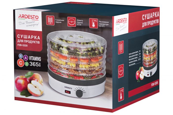 Сушка для продуктів Ardesto FDB-5320 - 245Вт/ 5 піддонів вис. 3см/ діаметр 32см/ рег. темп./ біла