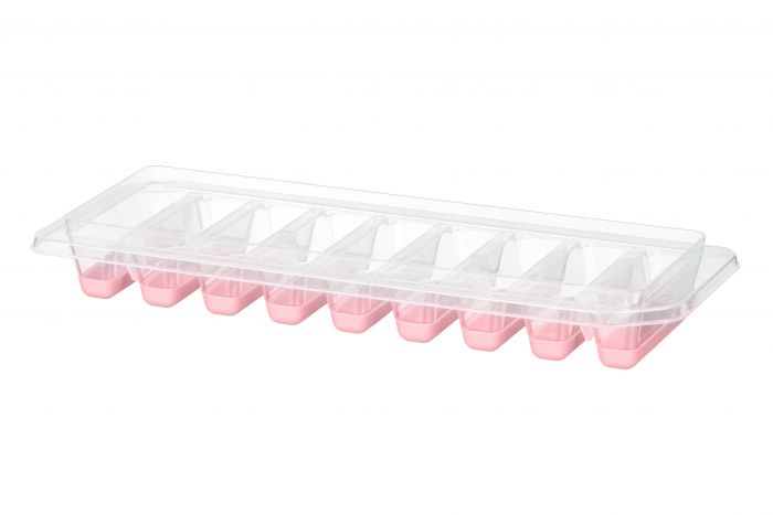 Пластикова прозора форма для льоду на дев’ять секцій з силіконовим дном та гнучкою кришкою з клапаном.