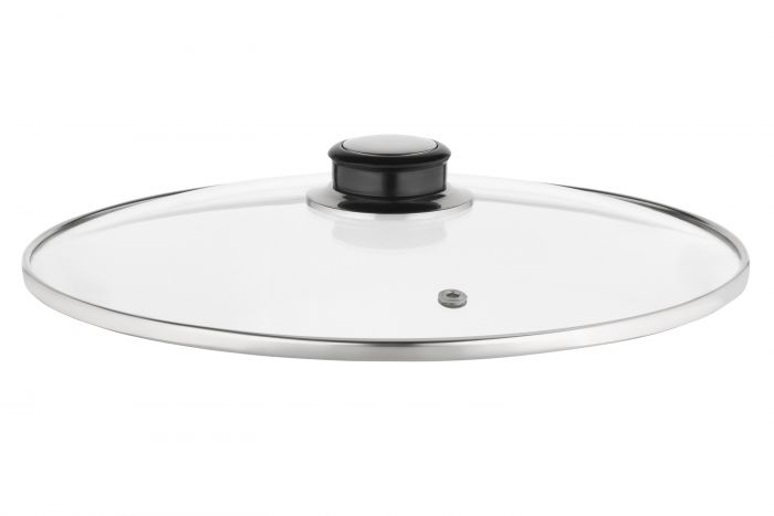 Скляна прозора кришка діаметром 22 см із ручкою із нержавіючої сталі. Можна мити в посудомийній машині.