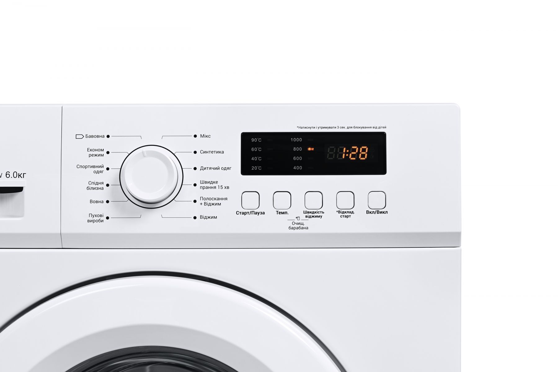 Програми:Синтетика, Спортивний одяг, Пухові речі, Полоскання + Віджим, Віджимання, Постільна білизна, Дитячий одяг