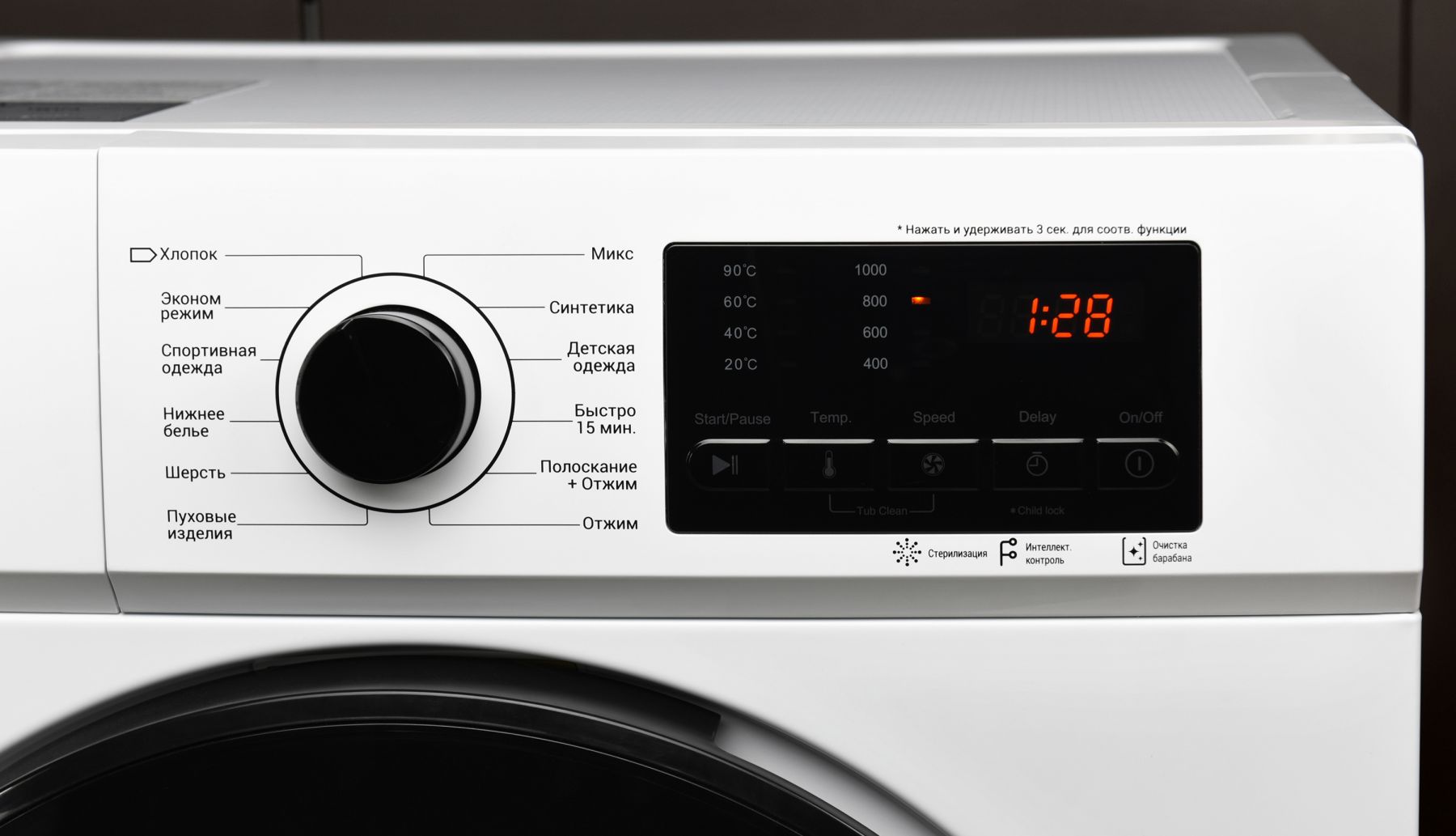 Програми:Синтетика, Спортивний одяг, Пухові речі, Полоскання + Віджим, Віджимання, Постільна білизна, Дитячий одяг