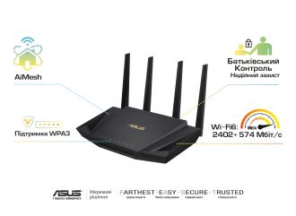 Дводіапазонний маршрутизатор стандарту Wi-Fi 6 (802.11ax) з інформаційним захистом AiProtection Pro на базі рішень Trend Micro і підтримкою технологій MU-MIMO, OFDMA та ASUS AiMesh.