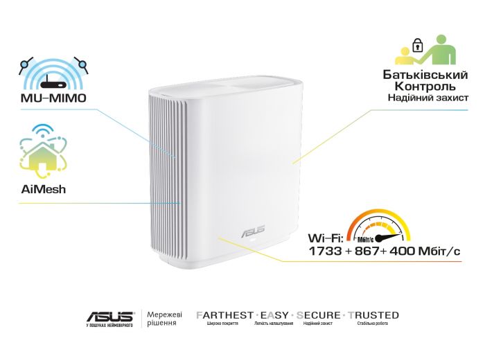 Mesh-система ZenWiFi AX складається з двох вузлів, кожен з яких представляє собою Wi-Fi маршрутизатор ASUS класу AX6600. Доступні різні варіанти підключення вузлів один до одного, разом вони забезпечують покриття швидкісний, надійної і захищеної мережею Wi-Fi всього простору будинку.