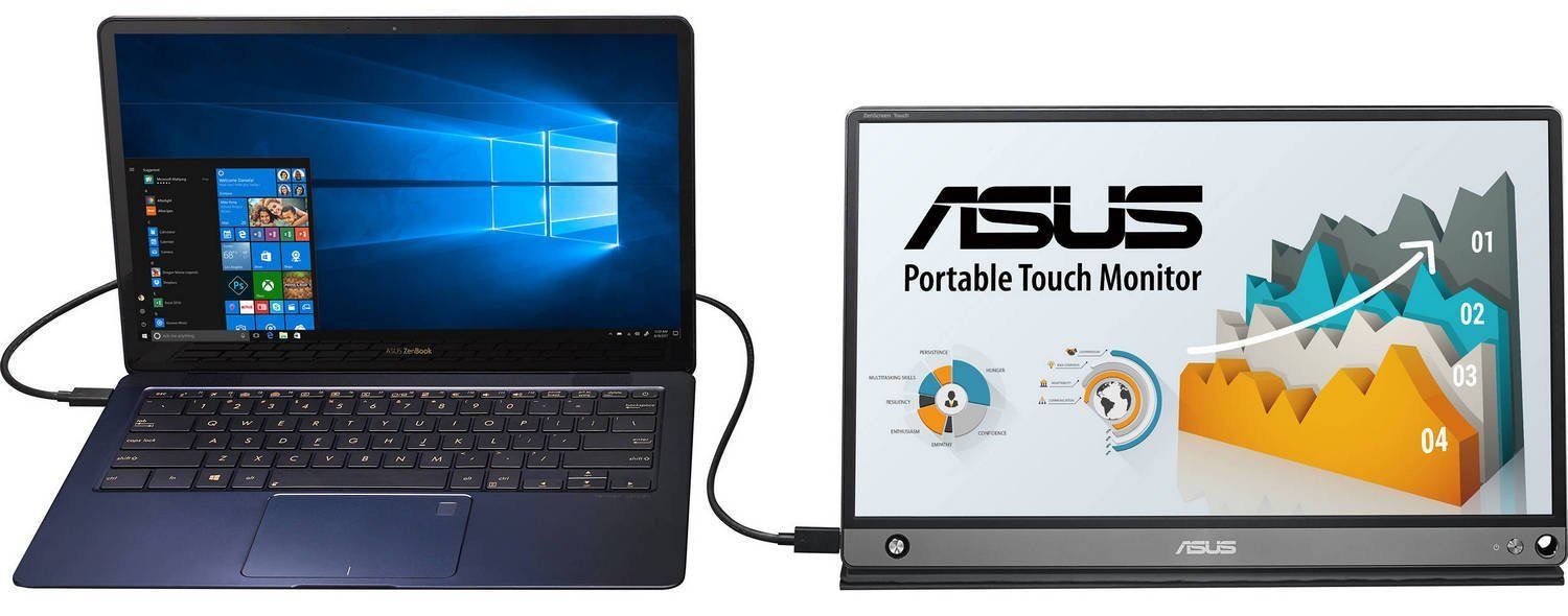 ASUS ZenScreen MB16AMT - це тонкий і легкий портативний монітор з вбудованим акумулятором ємністю 7800 мА·год і сенсорним інтерфейсом, що підтримує 10-пальцеві жести. За допомогою програми ZenScreen Touch його можна використовувати для виведення зображення з Android-смартфона і управління мобільними програмами, тому він прекрасно підходить для роботи поза офісом. Наявність двох інтерфейсів (гібридного USB-C і micro-HDMI) означає можливість підключення до різних джерел відеосигналу: ноутбуків, ігрових консолей, камерам, планшетів і т.д.