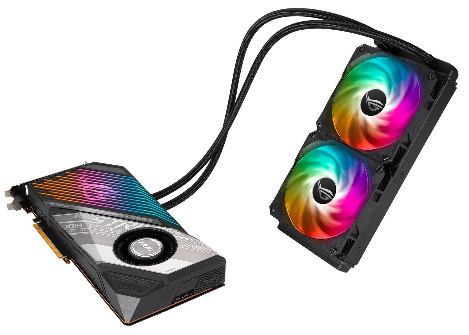 ROG Strix LC Radeon™ RX 6800 XT – левіафан із рідинним охолодженням. Холодна пластина з великою площею для рідинного охолодження кристала графічного процесора та відеопам’яті. Вбудований кулер підсистеми живлення з вентилятором і низькопрофільним радіатором. 240-мм радіатор: ефективність і сумісність із різними корпусами.Трубки довжиною 60 см: сумісність з EATX-корпусами та альтернативними кріпленнями.