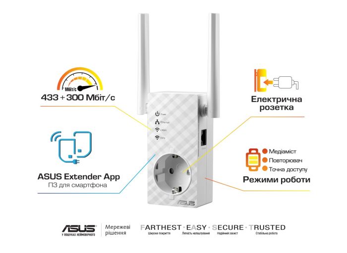 Повторювач Wi-Fi сигналу ASUS RP-AC53 AC750 1xFE LAN ext. ant x2 розетка