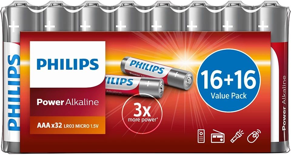 Philips Power Alkaline AAA LR03 — надійні лужні батарейки для щоденного використання. Упаковка з 32 штук у плівці забезпечує великий запас для побутових пристроїв: пультів, іграшок, ліхтариків, мишок чи годинників. Висока потужність і стабільна робота гарантують довгий термін служби.