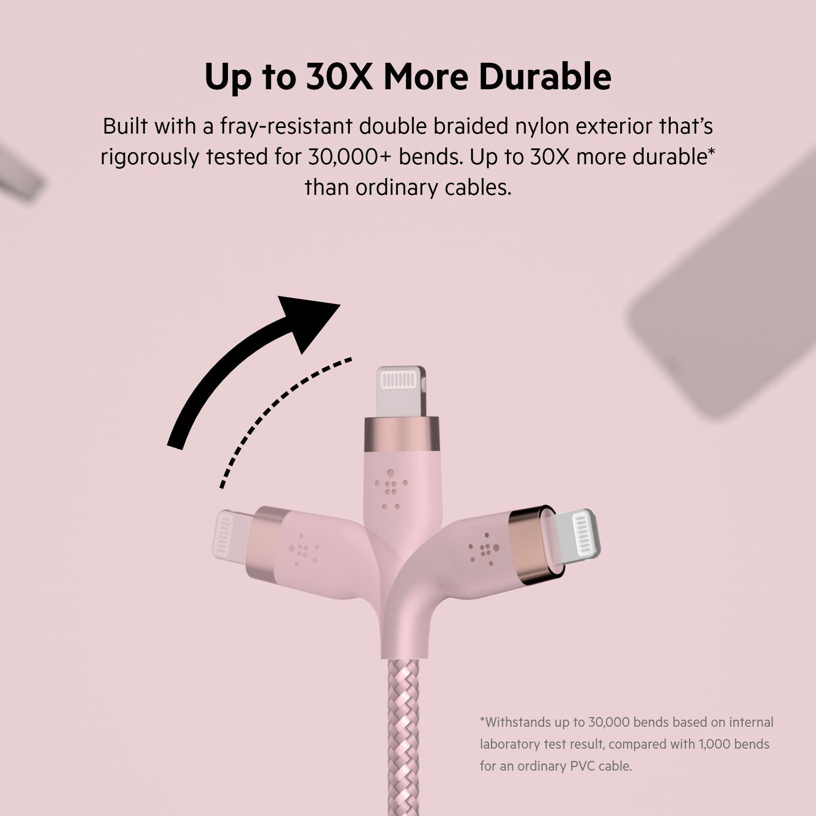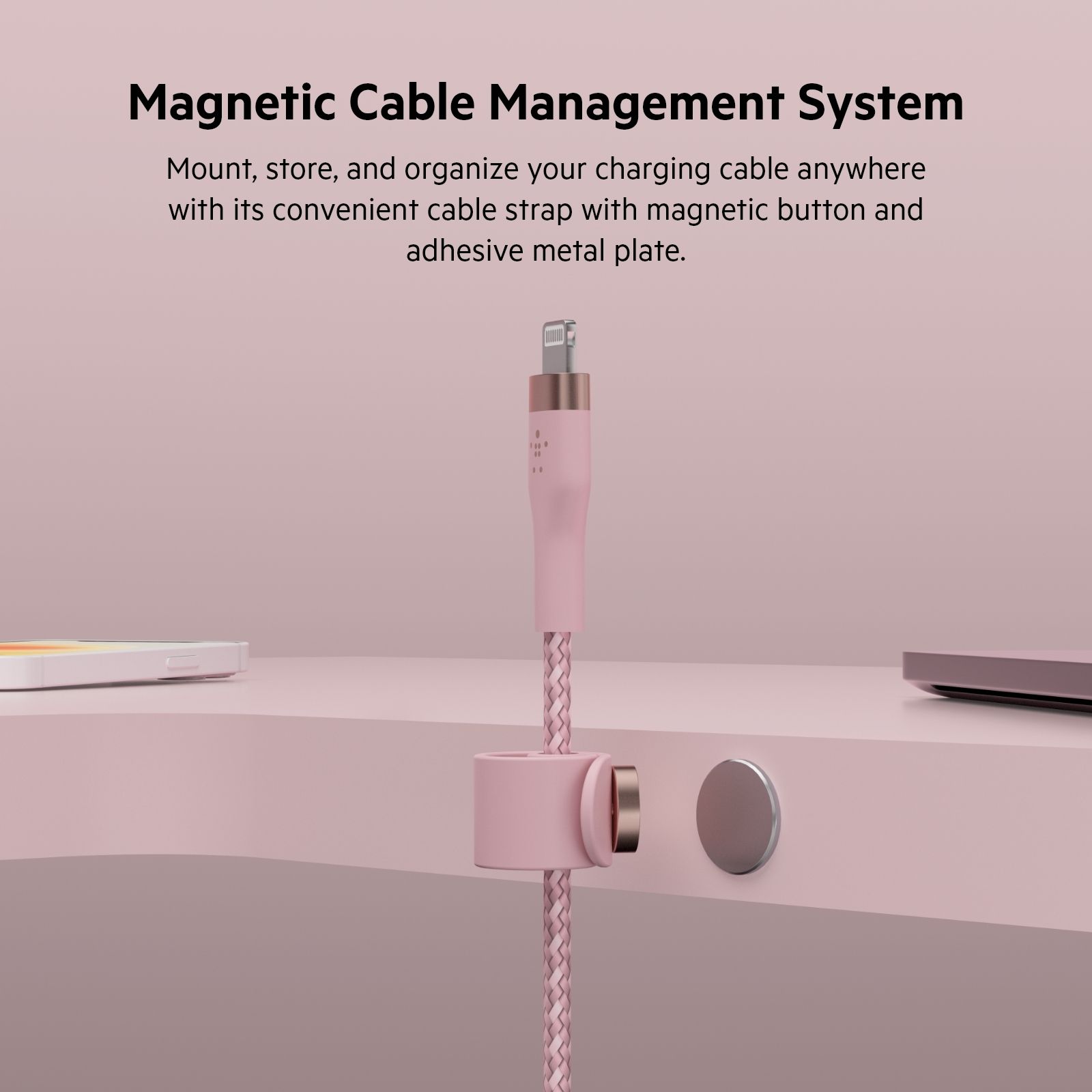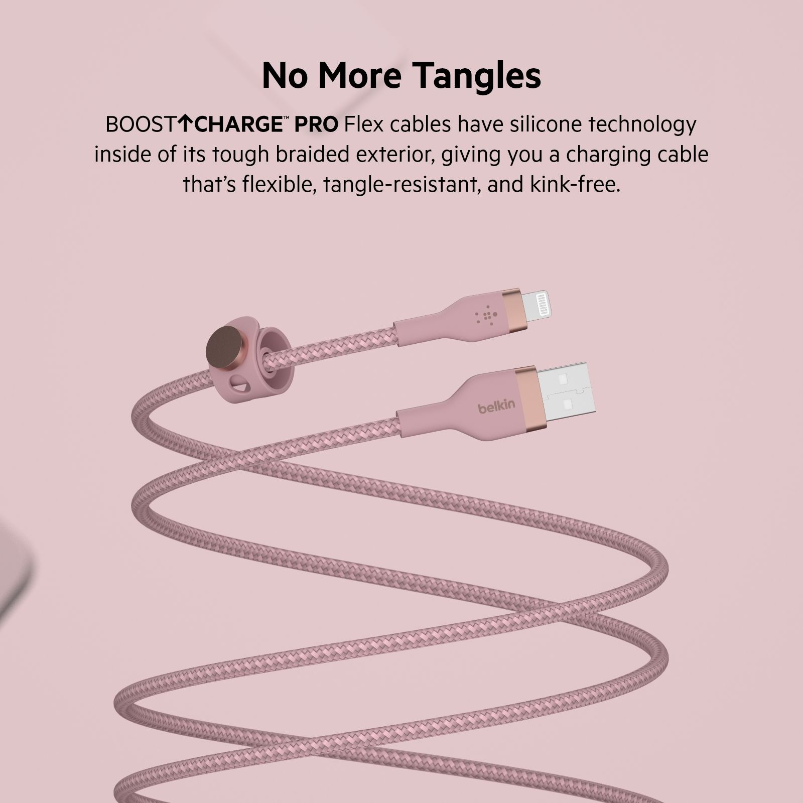 Кабелі BELKIN BOOST↑CHARGE PRO Flex створені, щоби витримувати щоденне навантаження та забезпечувати тривалу міцність у 30 разів вищу, ніж у звичайних кабелів. На кабелі є мініремінець (на три розмірні кріплення), магнітна кнопка та металева пластина на міцній клейкій основі 3М, що полегшують зберігання. Виготовлено із сатинованого алюмінію для додаткової міцності та стилю.