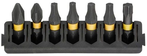 Набір біт DeWalt FlexTorq DT70810 включає 7 штук біт довжиною 25 мм різних типів: Phillips (Ph2), Pozidriv (Pz2) і Torx (T20, T25, T30). Виготовлені з високоякісної сталі, ці біти мають підвищену міцність та стійкість до зношування під час роботи з шурупокрутами та дрилями.