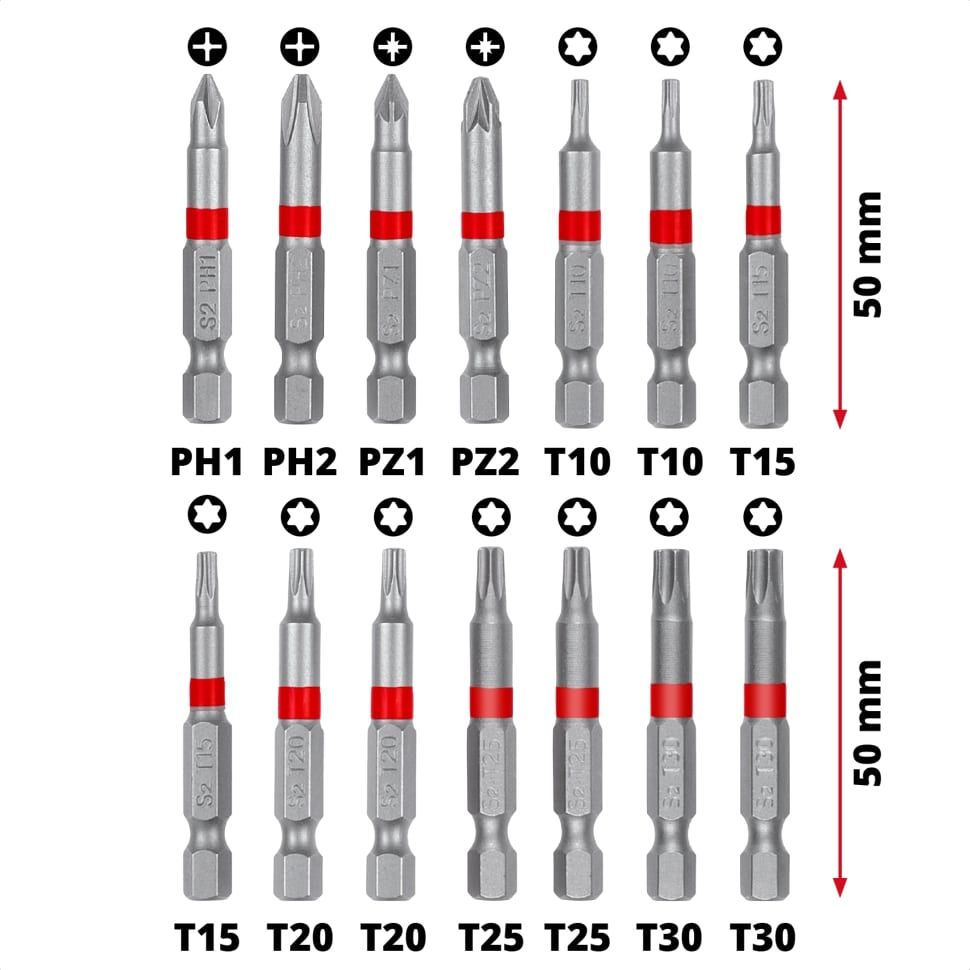 Біти, (50 мм):PH2, PZ2, T20, T25, PH 1, PZ1, T15, T10, T30