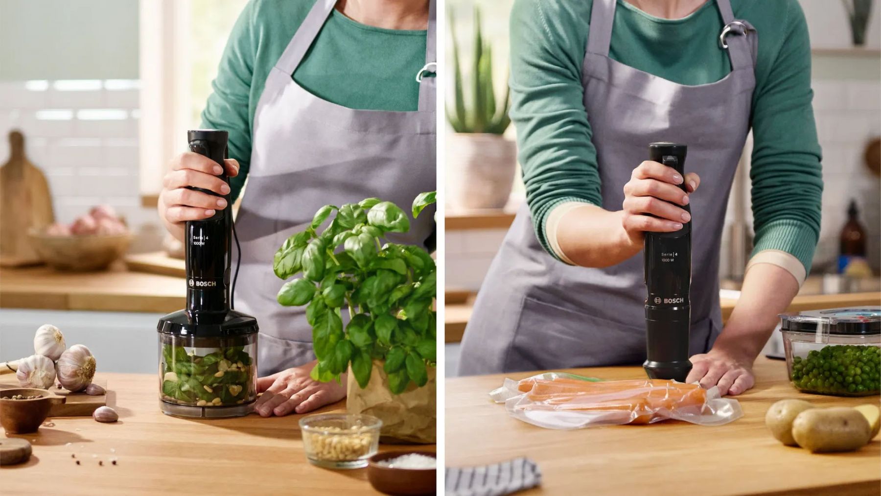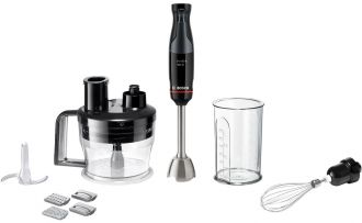 Заглибний блендер Bosch MSM4B670 потужністю 1000 Вт у чорному кольорі оснащений насадкою-блендером, подрібнювачем і вінчиком. Ідеальний для приготування соусів, кремів, смузі та тіста.