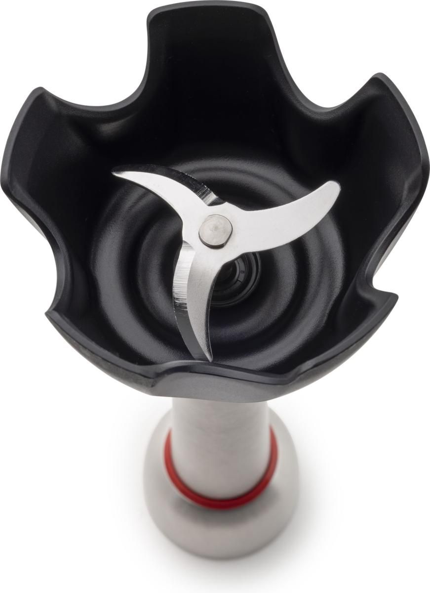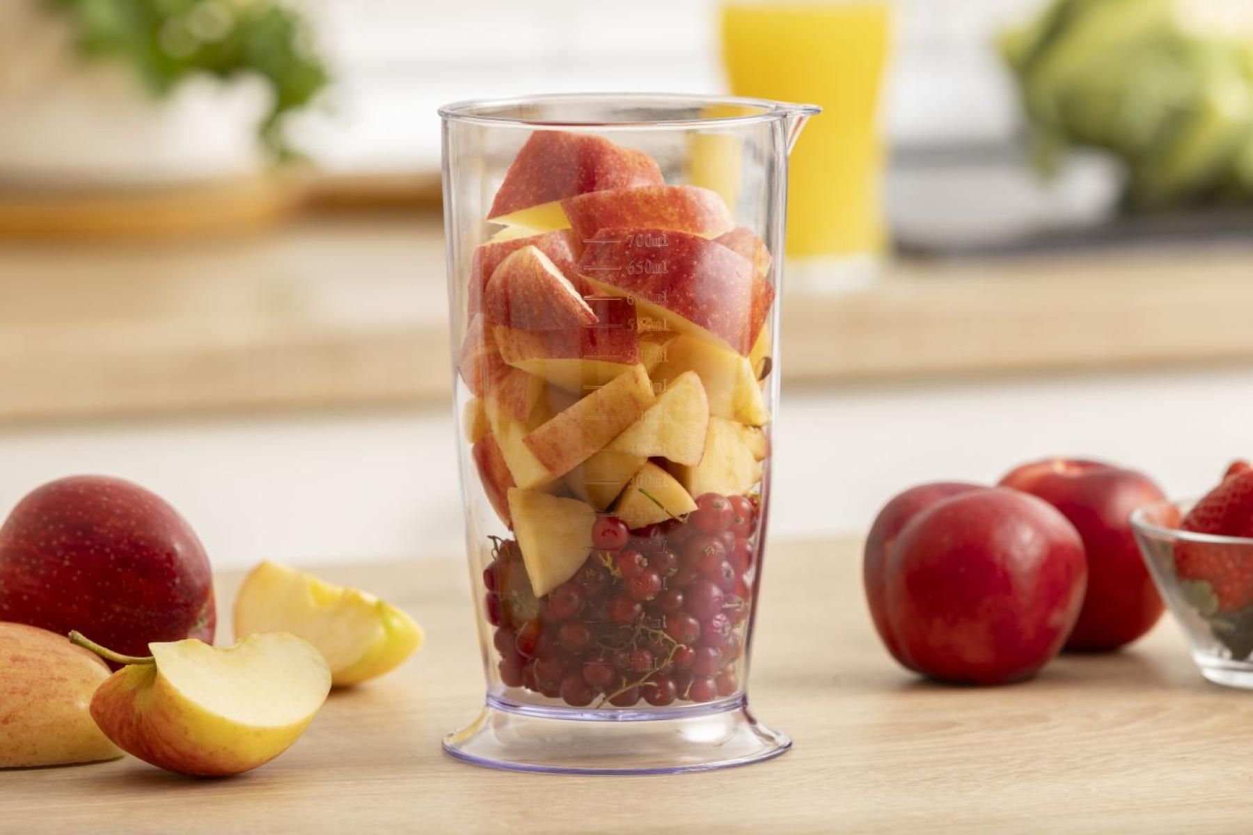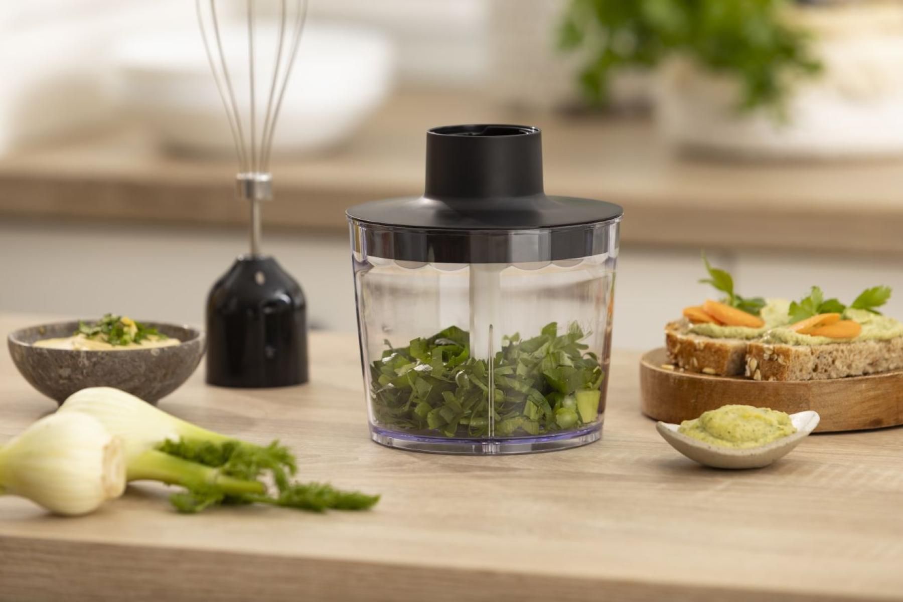 Додатково:мірна шкала на ємності, увімкнення натисканням кнопки, 4-лопасне лезо подрібнювача, насадки приєднуються обертальним способом, DC-двигун постійного струму