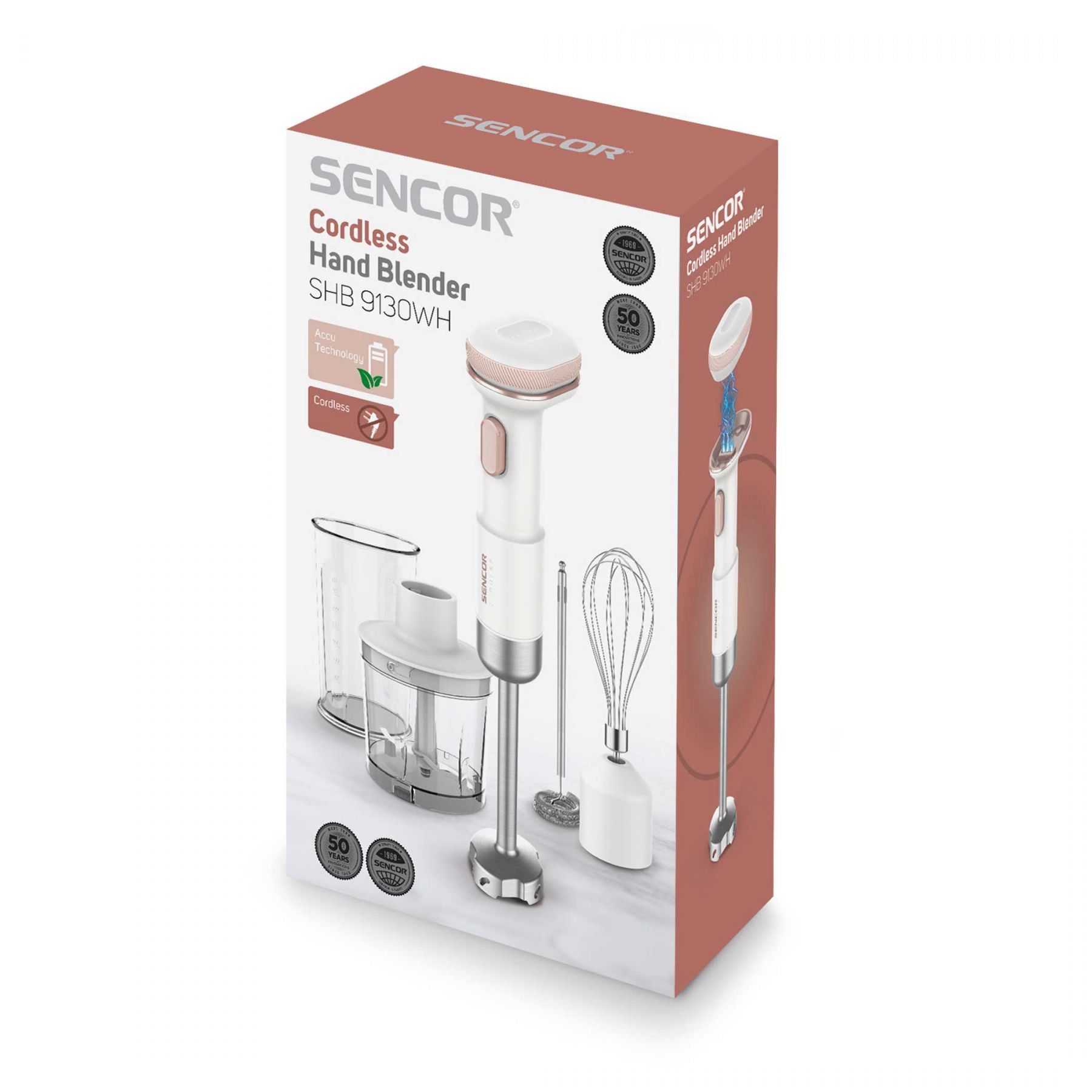 Безпровідний заглибний блендер 4в1 Sencor SHB9130WH з акумулятором 11,1 В та USB-C зарядкою. У комплекті вінчик, спінювач, подрібнювач (500 мл) і чаша (700 мл). До 25 циклів змішування на одному заряді. Плавне регулювання швидкості, титанові ножі, LED-індикатор.