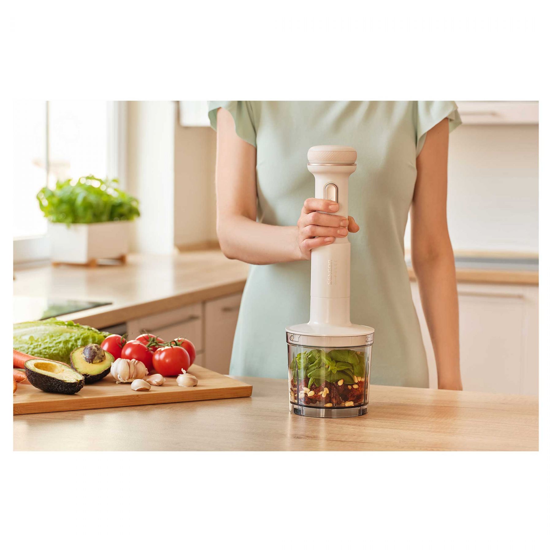 Комплектація:Акумулятор, вінчик, мірний стакан, зарядний кабель USB-C, Подрібнювач, спінювач молока, Моторний блок, Блендер з вбудованим лезом