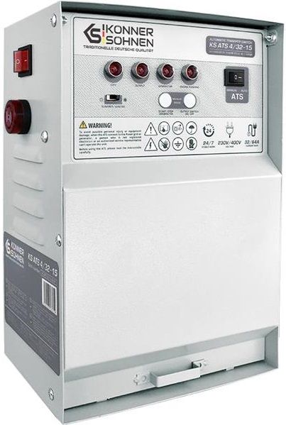 Блок автоматичного введення резерву (AВР) автоматично запускає генератор і передає навантаження на нього при відключенні основного джерела живлення та автоматично зупиняє роботу генератора при відновлення центрального електропостачання.8-контактний вихід AВР. Модель блоку АВР KS ATS 4/32-15 підходить для бензинових генераторів «Konner&Sohnen» KS 15-1E ATSR та KS 15-1E 1/3 ATSR.