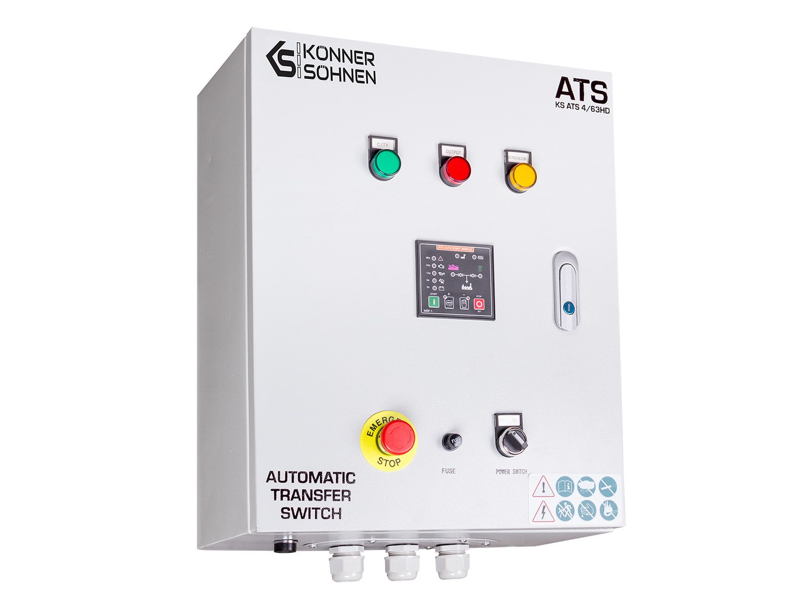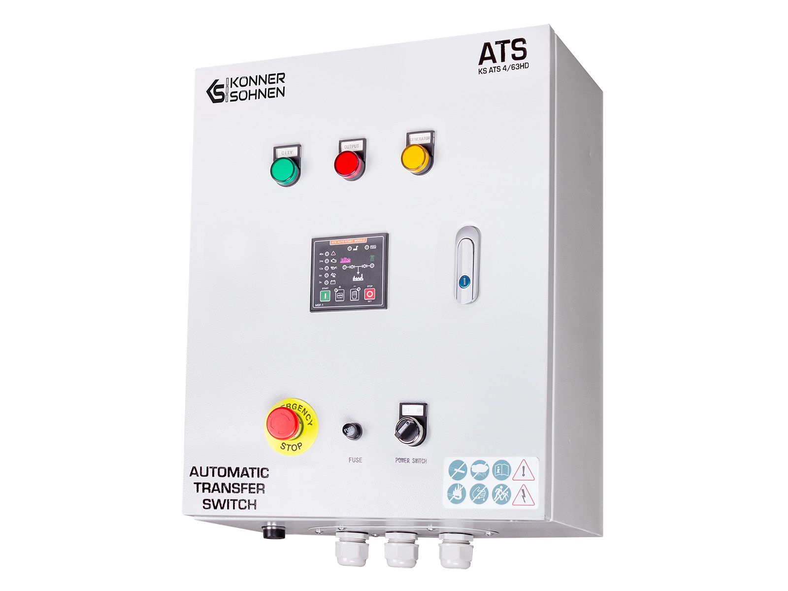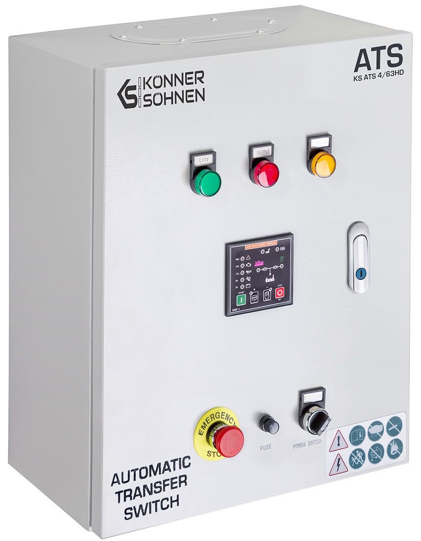 Блок автоматичного введення резерву (AВР) KS ATS 4/63HD німецької торгової марки Könner & Söhnen автоматично запускає генератор і перемикає навантаження на нього при відключенні основного джерела живлення, та автоматично зупиняє роботу генератора при відновленні центрального електропостачання.