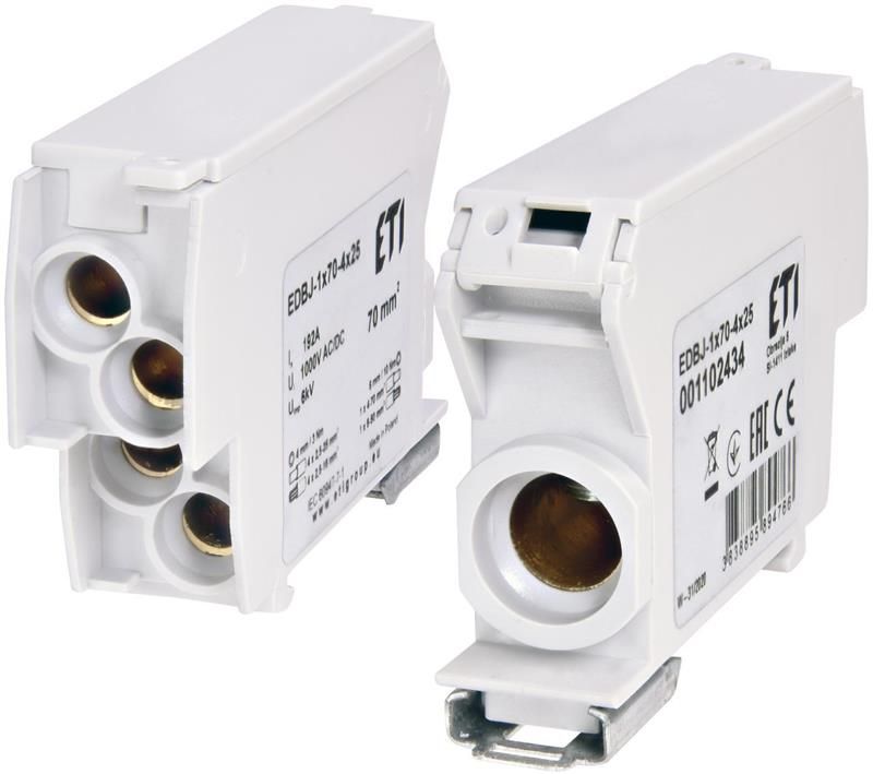 Блок розподільчий ETI EDBJ-1x70-4x25 — компактний розподільний термінал для безпечного та зручного розведення потужних струмів до 192 А в однофазних і трифазних системах. Вхід 1×70 мм², вихід 4×25 мм², номінальна напруга до 1000 В AC / 1500 В DC — ідеально підходить для сонячних станцій, промислових щитів, резервного живлення та систем з великими перетинами кабелю. Сірий ударостійкий корпус з прозорою кришкою забезпечує IP20 захист і чіткий огляд підключень. Проста установка на DIN-рейку або монтажну панель, надійні гвинтові клеми та висока механічна міцність гарантують довговічну експлуатацію без перегріву. Це професійне рішення для електромонтажників, які працюють з потужними навантаженнями та потребують акуратного розподілу струму.