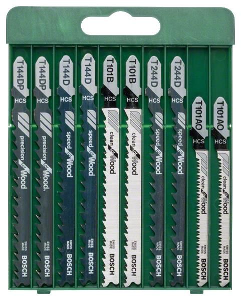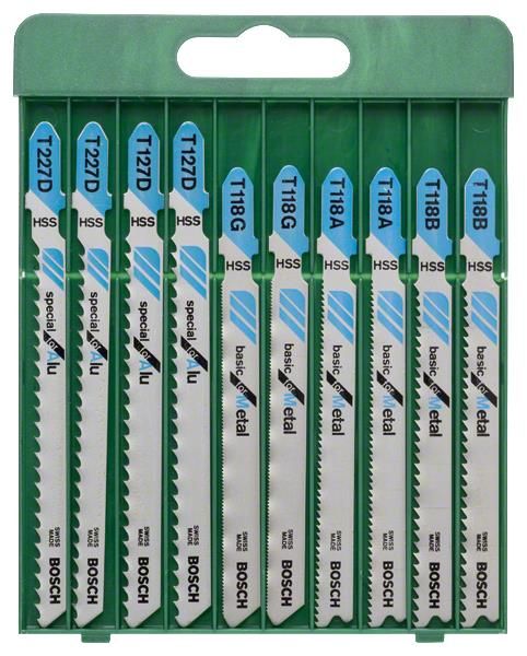 Пилки для лобзика (10 шт.) SET T-ХВ. DIY Bosch 2.609.256.745 призначені для різання металу, що має різну товщину. Даний набір включає в себе 5 типів полотен: T 118 A - для тонкої жесті, T 118 B - для жесті середньої товщини, T 118 G - для тонкої жесті, T 127 D - для товстої або тонкої жесті і труб, T 227 D - спеціально для криволінійного різання металу, труб і профілів. Вид різу - прямий, фігурний, чистий.