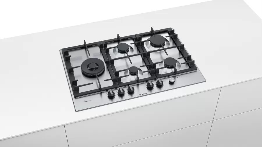 Варильна поверхня газова Bosch PCS7A5M90 -75см/5 кн/чавун/WOK/нерж. Газова варильна поверхня з нержавіючої сталі з технологією FlameSelect: ідеальні кулінарні результати завдяки дев'яти точним сходинкам потужності полум'я. Обладнана дев'ятьма точно визначеними рівнями потужності, FlameSelect дозволяє легко регулювати рівень вогню саме так, як це потрібно Вам. Від рівня 1 – для кип'ятіння на повільному вогні, до рівня 9 – для активного кипіння. Ідеальний результат простим рухом руки. Конфорки: 1 потужна, 2 стандартні, 1 економічна, 1 Wok.