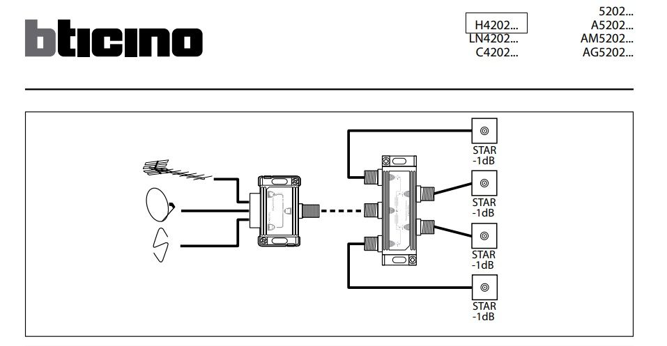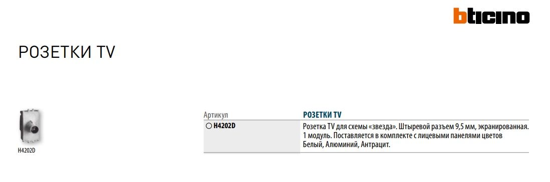 Коаксіальний роз'єм "зірка" для одного користувача антенних систем, також з дистанційним живленням і централізованими системами, а також розрахованих на одного користувача / централізованих супутникових систем з передачею струму і сигналу для вибору каналів; екрановані сполучні затискачі з невипадаючими гвинтами - Ø 9,5 мм; штекер - поставляється в упаковці з загальним механізмом і передніми кришками в різних естетичних варіантах - 1 модуль.