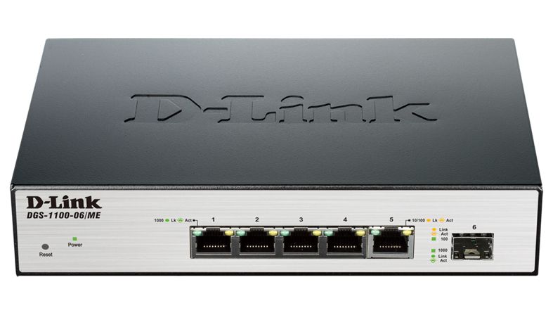 Комутатор DGS-1100-06 / ME оснащений 5 портами 10/100 / 1000Base-T і 1 SFP-портом. Призначений для розгортання мереж Metro Ethernet, даний комутатор виконаний в надійному корпусі і підтримує функції Multicast для IPTV-додатків. 5 портів 10/100/1000 Мбіт / с оснащені вбудованим захистом від перенапруг до 6 кВ. Наявність оптичного порту SFP надає можливість побудови мереж FTTx.