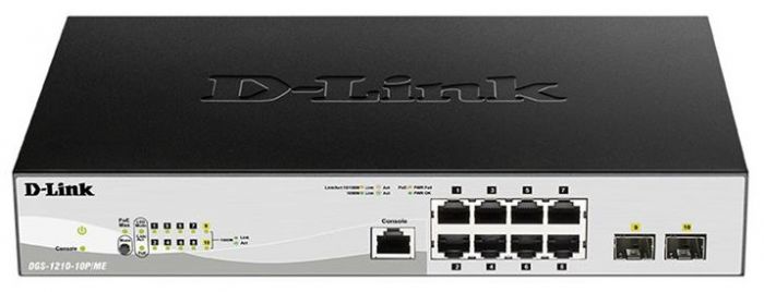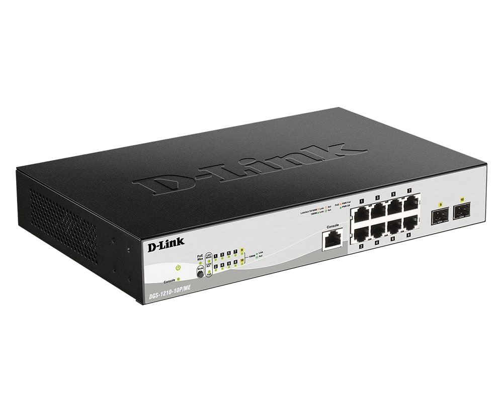Комутатор DGS-1210-10P/ME є ідеальним рішенням для застосування в мережах Metro Ethernet. Даний комутатор оснащений 8 портами 10/100/1000Base-T з підтримкою PoE для підключення по витій парі, а також 2 SFP-портами, застосовуваними для організації підключення до високошвидкісної магістралі. Захист від статичної електрики 6 кВ забезпечує стійкість до скачків напруги, а повний набір функцій безпеки і аутентифікації захищає мережу від внутрішніх і зовнішніх загроз.