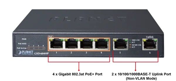 У PLANET GSD-604HP передбачено чотири порти 802.3at PoE для живлення портів малих мереж IP-відеоспостереження за низькою вартістю. Записані HD відео файли із 4 камер IP можуть отримувати живлення від GSD-604HP. Інформація зберігається у 4-канальний відеореєстратор системи, також можна вести спостереження програмного забезпечення для виконання комплексного моніторингу безпеки, керування системою відеоспостереження у локальній мережі або віддалено через Інтернет.
