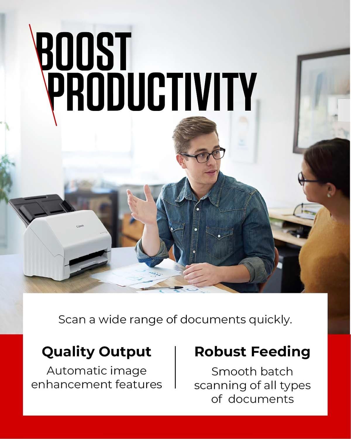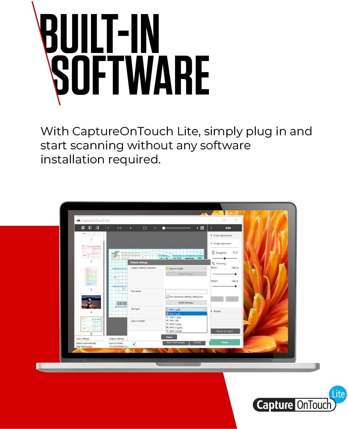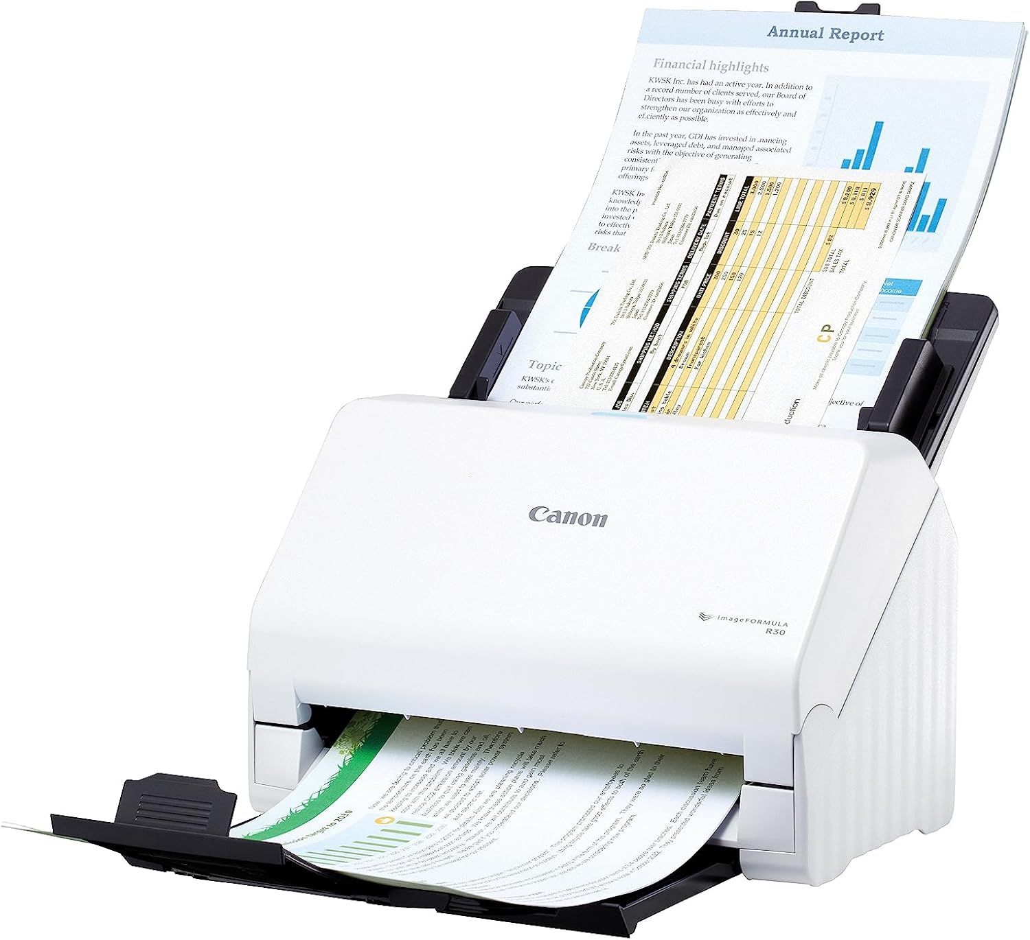 Canon imageFORMULA R30 — компактний професійний сканер із ADF (60 аркушів), що швидко сканує обидві сторони до 25 сторінок на хвилину (50 односторонніх) у кольорі та чорно-білому режимі. Має вбудоване ПЗ CaptureOnTouch Lite — просто під’єднай і скануй. Працює з Windows і Mac, споживає <10 Вт, з енергоефективною конструкцією та рік гарантії.