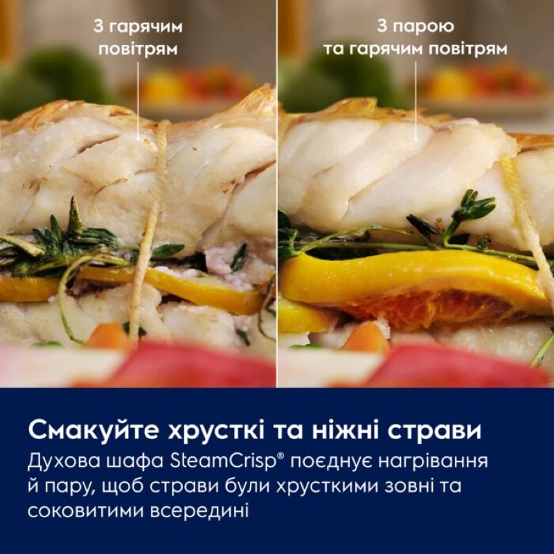 Електрична духова шафа Electrolux серії 700 MealAssist поєднує гаряче повітря та пару з технологією SteamCrisp® для хрусткої скоринки та ніжної серединки. EXCite — сенсорний TFT-дисплей — спрощує керування, термощуп контролює готовність усередині страви, а AquaClean допомагає швидко очистити камеру парою. Підтримується керування через застосунок Electrolux.