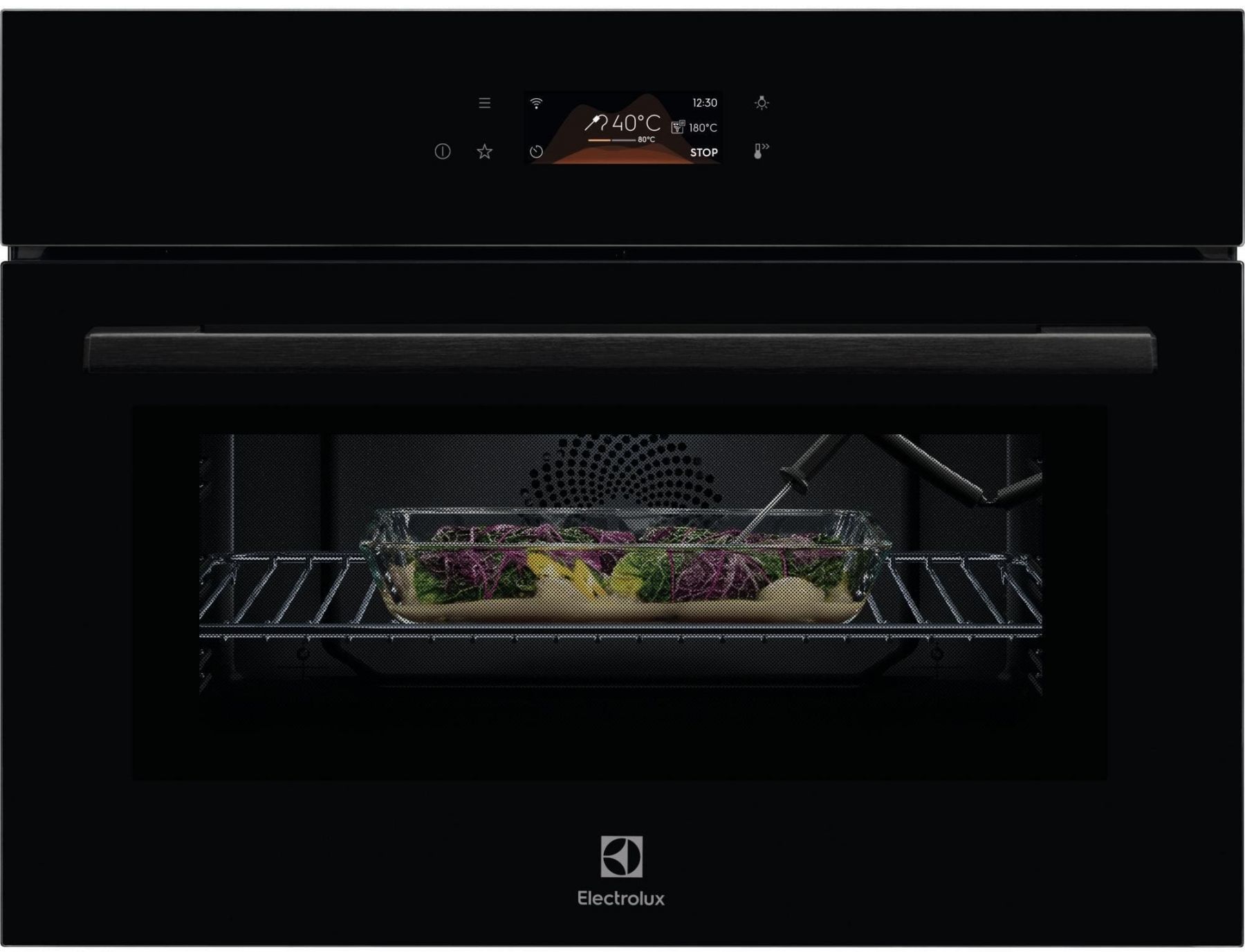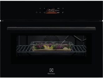 Компактна вбудована електрична духова шафа Electrolux 800 MealAssist CombiQuick® поєднує конвекційний нагрів і мікрохвильову обробку для скорочення часу приготування приблизно вдвічі. Керування здійснюється через сенсорний TFT-дисплей EXCite з миттєвим зворотним зв’язком. Функція Assisted Cooking автоматично пропонує оптимальні параметри для різних страв. Для точного контролю готовності передбачено термощуп, а конвекційна система забезпечує рівномірне приготування.