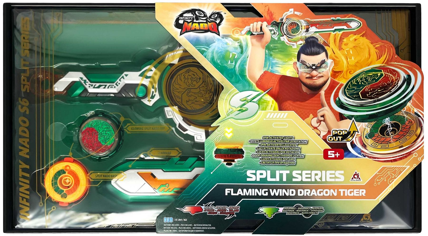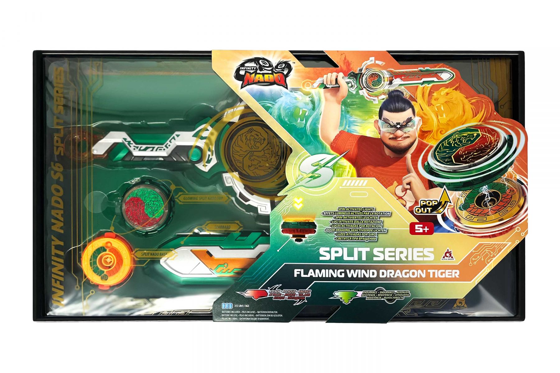 Infinity Nado VI серії Split Series – дзиґа нового 6 покоління зазнала значних вдосконалень, що беззаперечно подарують нові емоції від ще більш видовищних та цікавих поєдинків. Абсолютно нова система запуску дзиґи на арену реалізована за допомогою епічного лаунчера у вигляді меча, що має більший розмір і вдосконалений зовнішній вигляд, пускова система покликана забезпечить контрольований швидкісний запуск.