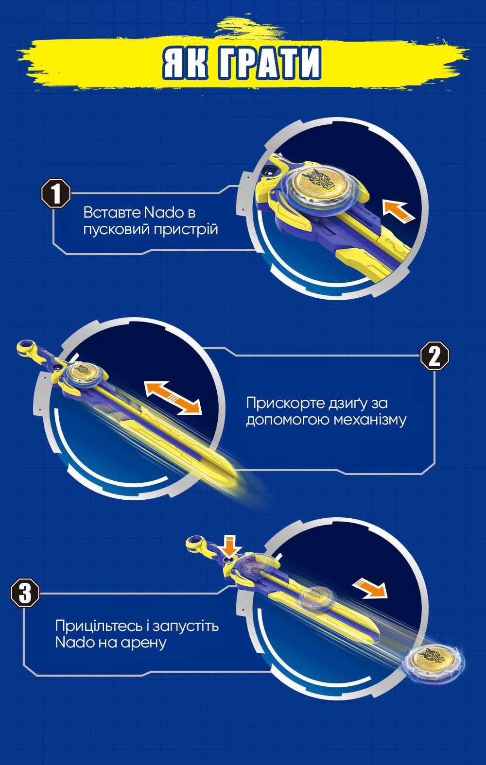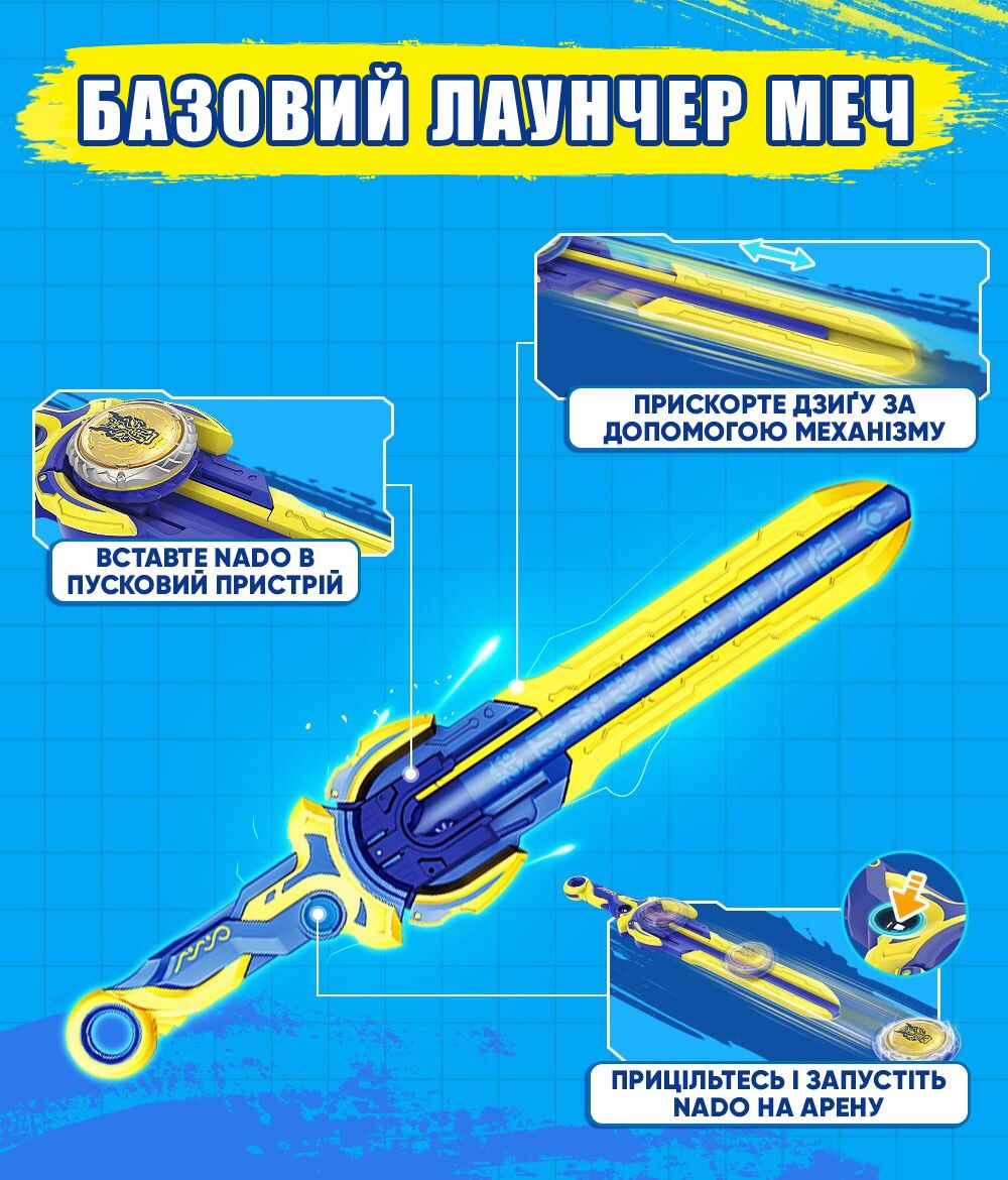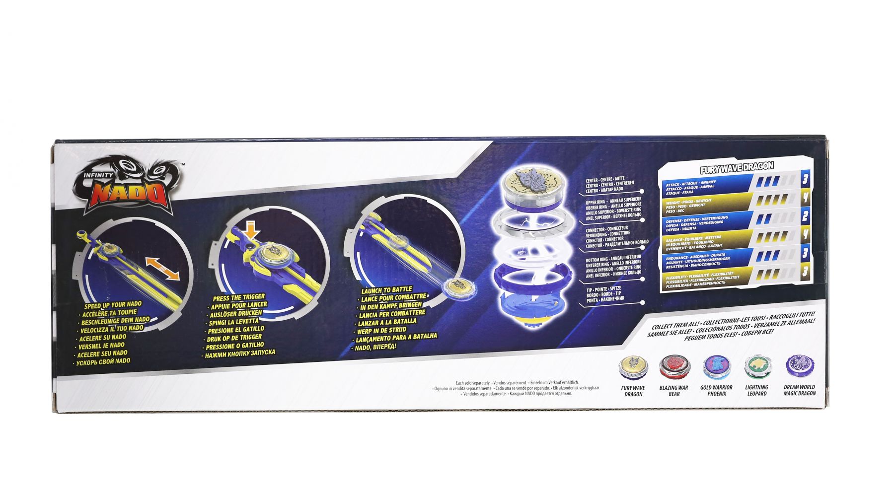 Infinity Nado VI серії Standard Pack – дзиґа нового 6 покоління зазнала значних вдосконалень, що беззаперечно подарують нові емоції від ще більш видовищних та цікавих поєдинків. Абсолютно нова система запуску дзиґи на арену реалізована з допомогою епічного лаунчера у вигляді меча, пускова система покликана забезпечити контрольований швидкісний запуск.