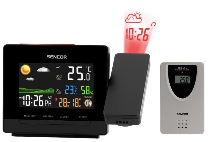 Функції:будильник, можливість вибору 12- чи 24-часового формату, дата, температура и влажность в помещении, цифровое время, радиоуправляемые часы, показания наружной температуры, функция оповещения о наружной температуре, проекция прогноза погоды со временем или температурой, функция вращения содержимого проекции