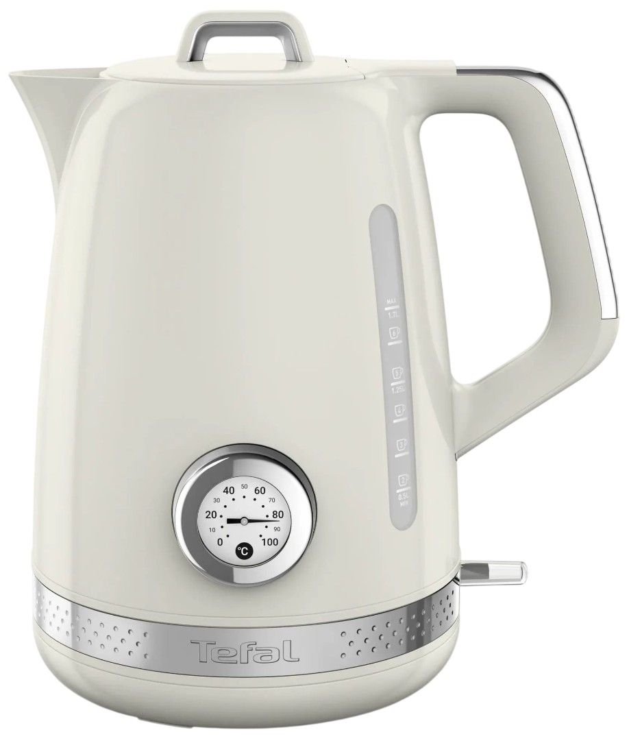 Електрочайник Tefal Soleil+ поєднує сучасну функціональність із ретро-дизайном у бежевому кольорі. Об’єм 1.7 л дозволяє кип’ятити воду для кількох чашок напоїв за один цикл. Модель оснащена вбудованим термометром для контролю температури води та надійним термостатом Strix для безпечної роботи. Відкидна кришка й індикатор рівня води спрощують наповнення та контроль об’єму. Знімний фільтр від накипу допомагає підтримувати чистоту води під час щоденного використання.