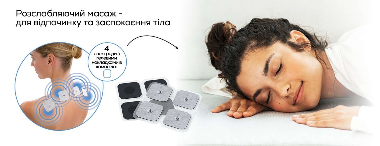 Комплектація:інструкція, батарейки, 4 самоклеючих електроди (45 x 45 мм)