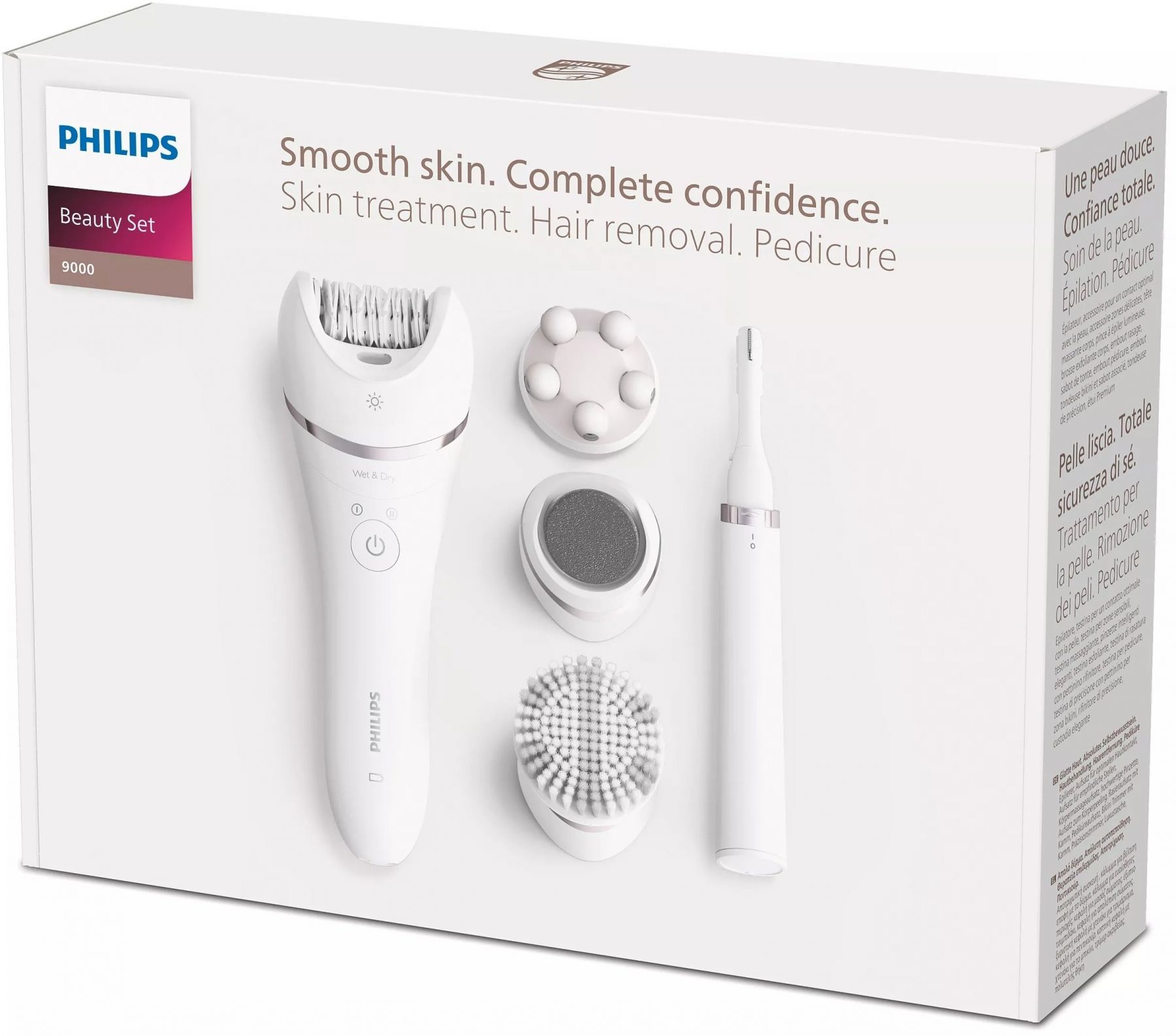 Гладенька шкіра. Стовідсоткова впевненість. Beauty Set 9000 – це комплексне рішення для розкішної гладенької шкіри від голови до п’ят. Складається з епілятора та ручки-тримера. Завдяки різноманітним насадкам і аксесуарам підходить для обробки шкіри, брів, тіла та ніг.