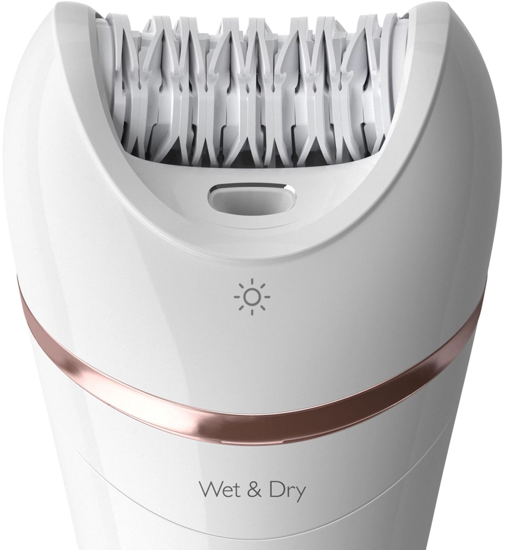 Насадки:для пілінгу, масажна насадка, бритвена голівка, для чутливих ділянок тіла, для оптимального контакту, тример для лінії бікіні, гребінець тримера для зони бікіні, шліфувальна пилочка для ніг, пінцет з підсвіткою, тример-олівець, тример-гребінець